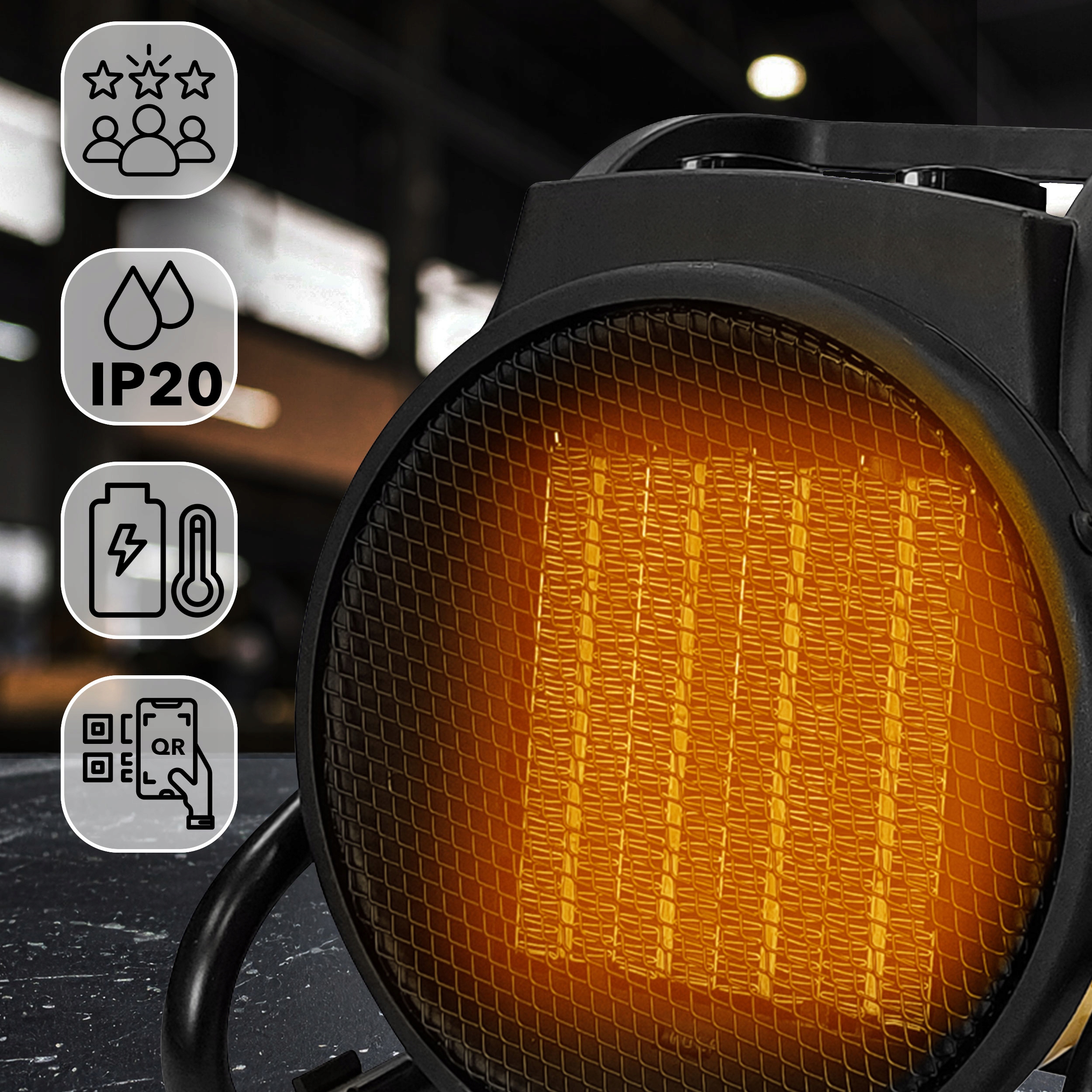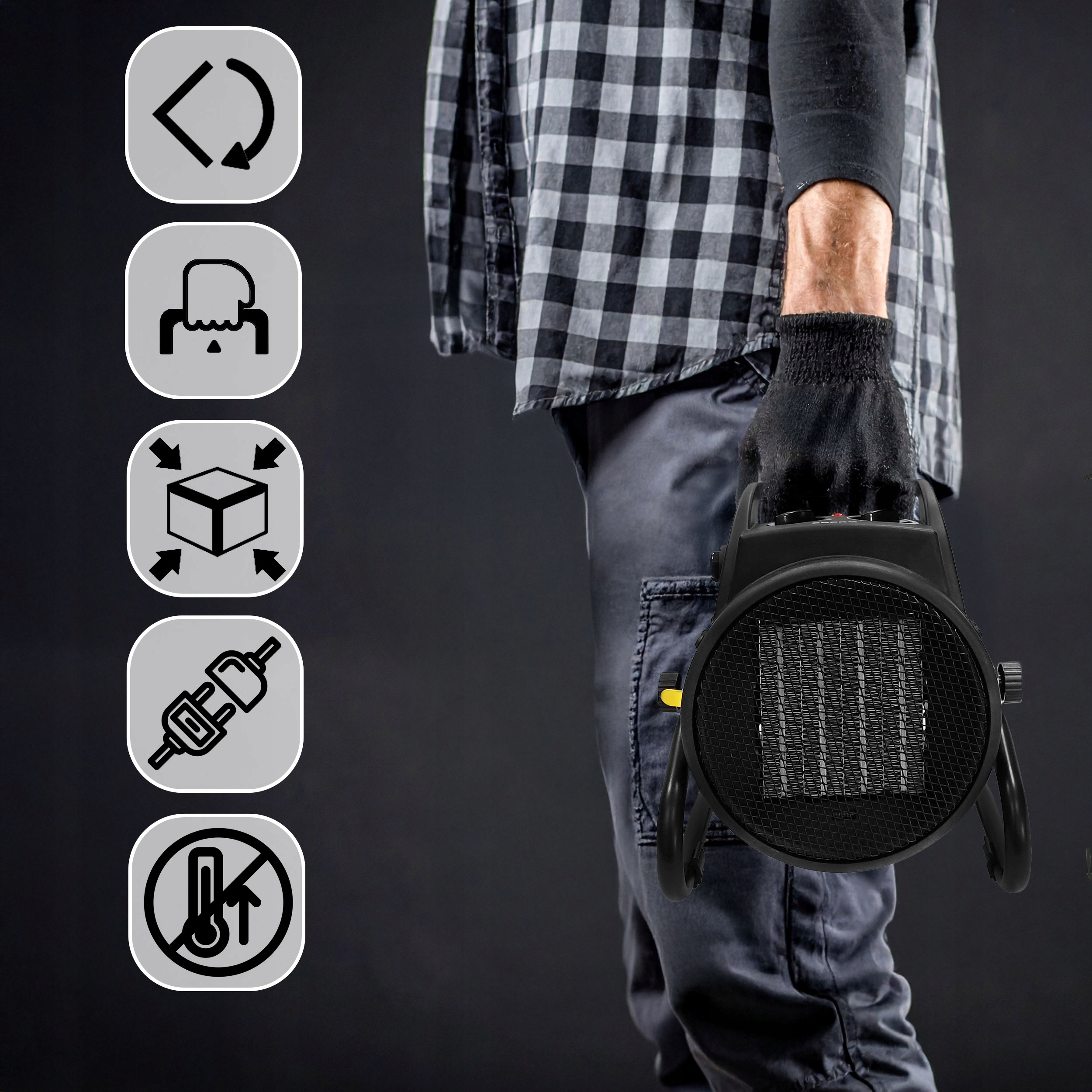 Szybko i skutecznie dogrzewa każde domowe pomieszczenie – od salonu i kuchni, po piwnicę czy przydomowy warsztat – zapewniając komfort ciepła natychmiast po włączeniu. Równie dobrze sprawdza się w magazynach, profesjonalnych warsztatach, kwiaciarniach, lokalach gastronomicznych czy halach produkcyjnych, gdzie liczy się moc, trwałość i pewne działanie. Wbudowany wentylator rozprowadza ciepło równomiernie, dzięki czemu natychmiast dociera ono do stanowiska pracy.