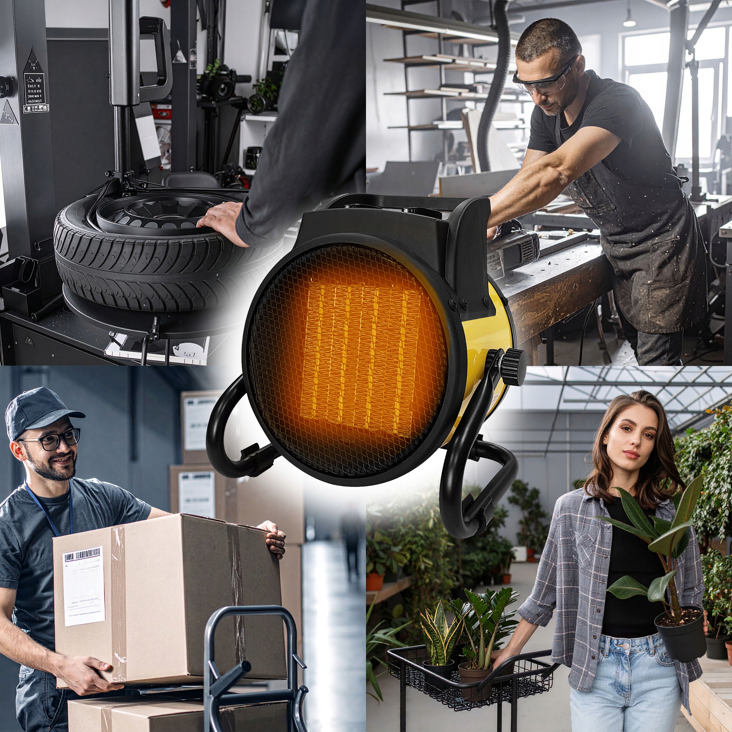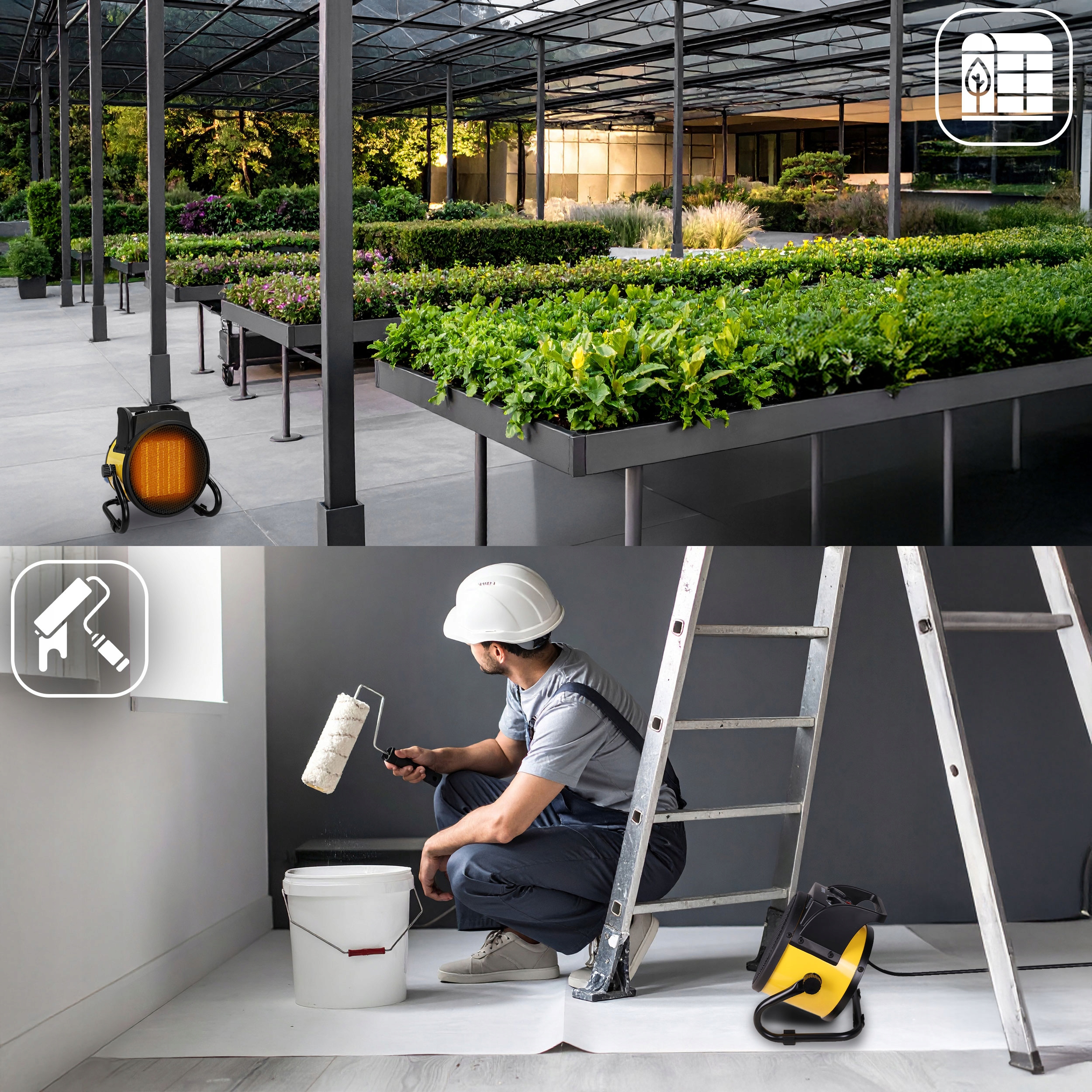 Szybko i skutecznie dogrzewa każde domowe pomieszczenie – od salonu i kuchni, po piwnicę czy przydomowy warsztat – zapewniając komfort ciepła natychmiast po włączeniu. Równie dobrze sprawdza się w magazynach, profesjonalnych warsztatach, kwiaciarniach, lokalach gastronomicznych czy halach produkcyjnych, gdzie liczy się moc, trwałość i pewne działanie. Wbudowany wentylator rozprowadza ciepło równomiernie, dzięki czemu natychmiast dociera ono do stanowiska pracy.