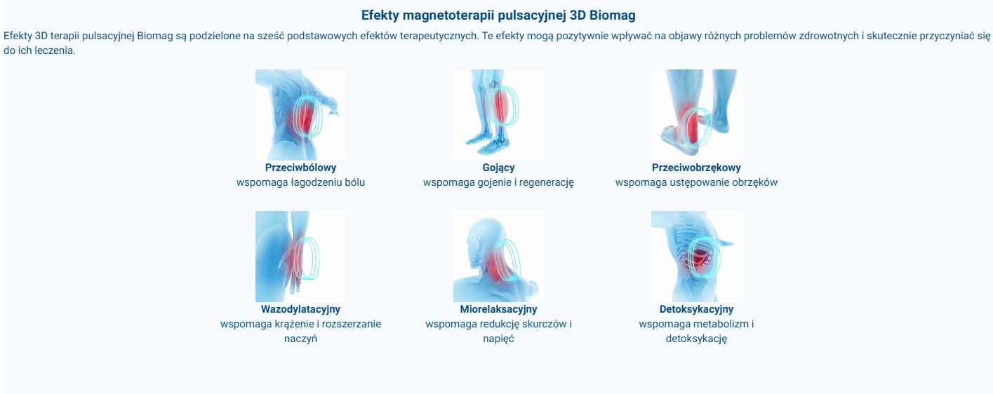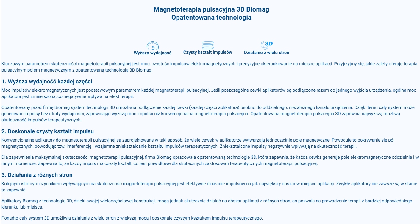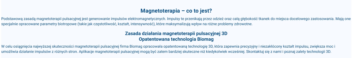 Podstawową zasadą magnetoterapii pulsacyjnej jest generowanie impulsów elektromagnetycznych. Impulsy te przenikają przez odzież oraz całą głębokość tkanek do miejsca docelowego zastosowania. Mają one specjalnie opracowane parametry biotropowe (takie jak częstotliwość, kształt, intensywność), które maksymalizują wpływ na różne problemy zdrowotne.