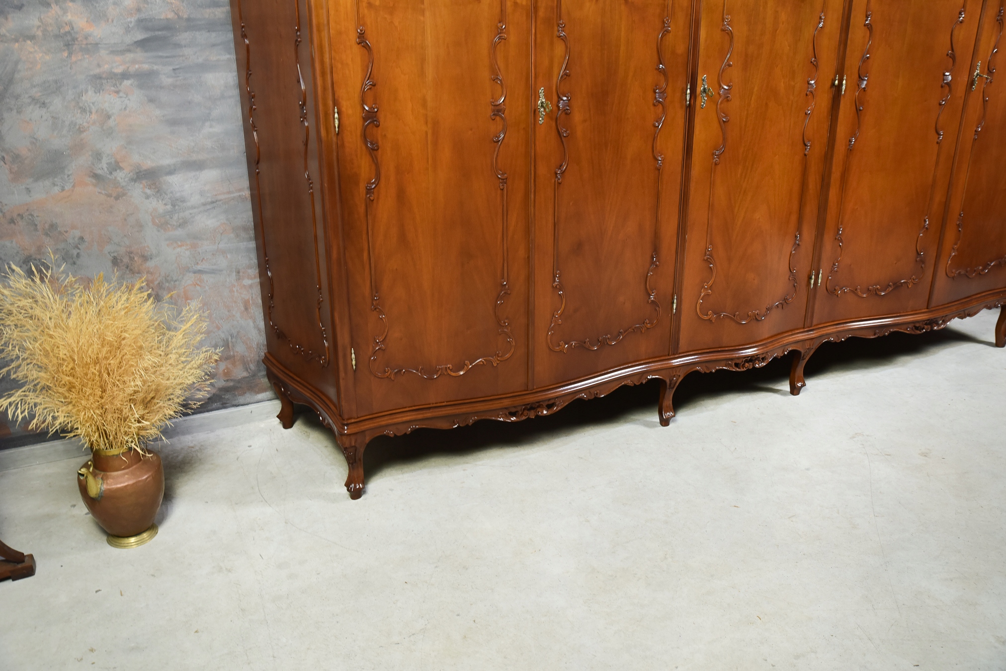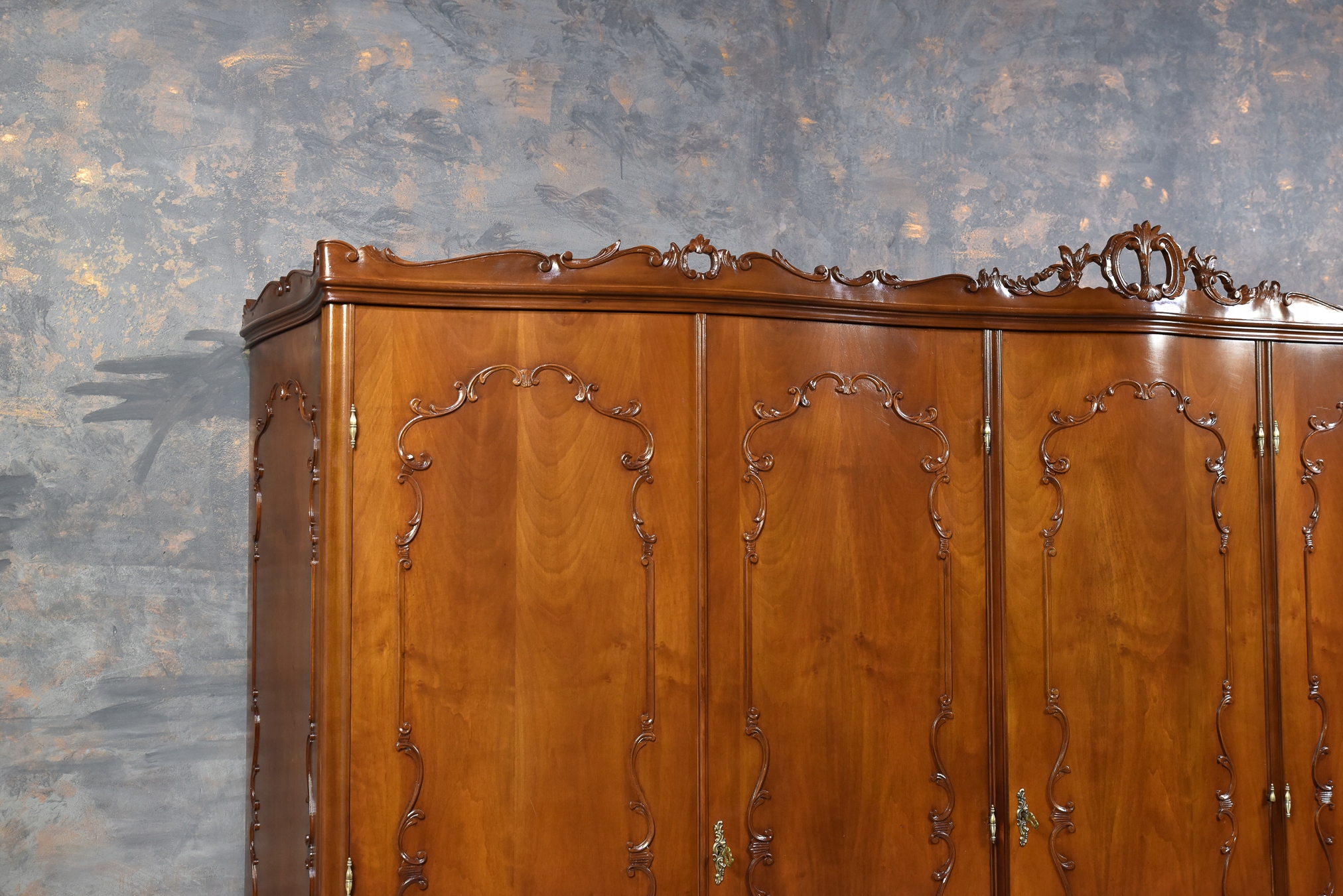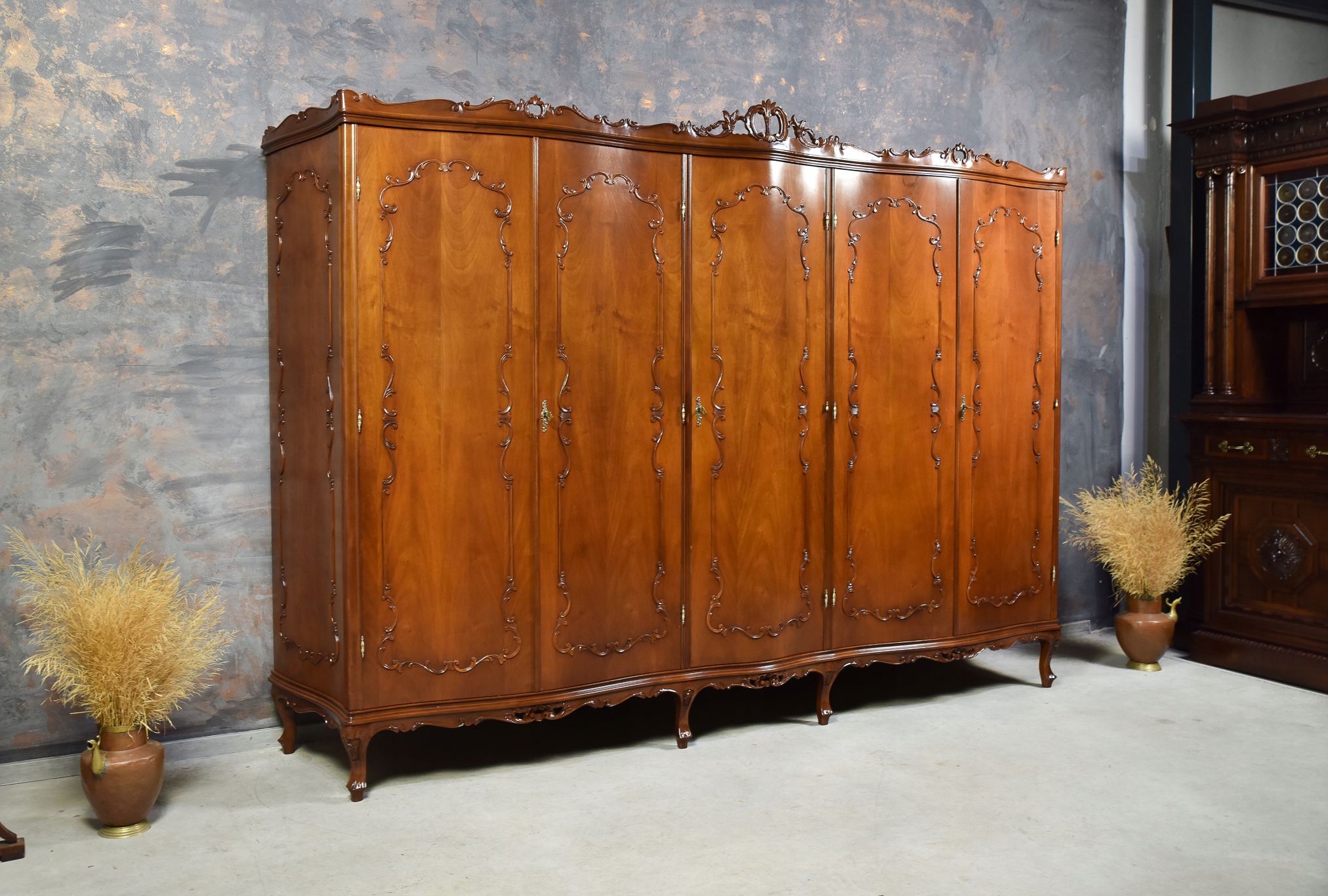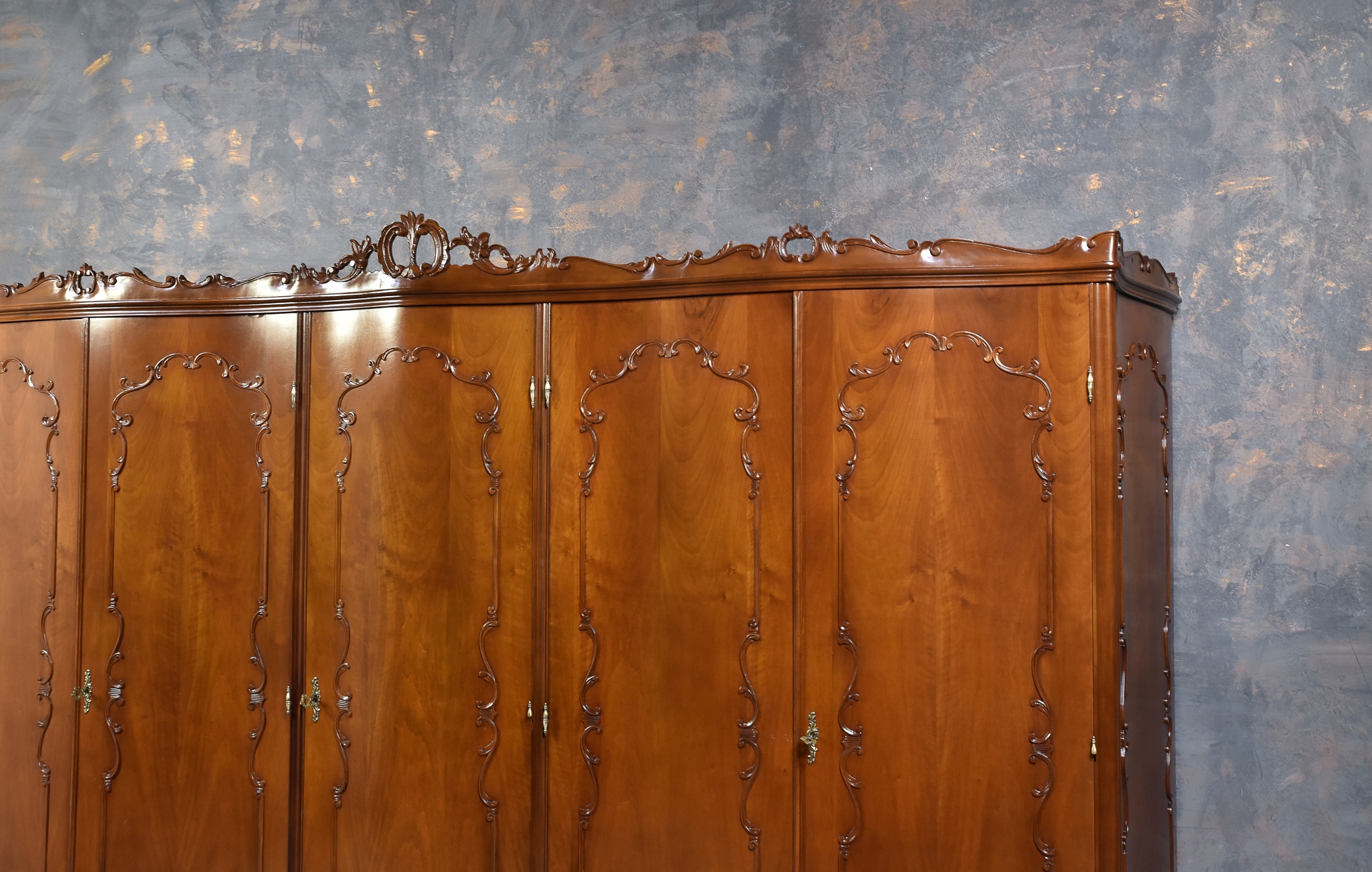 Prezentujemy elegancką, pięciodrzwiową szafę wykonaną z drewna orzechowego w stylu neorokokowym, inspirowanym epoką Ludwika XV. Mebel powstał w latach 1950/1960.