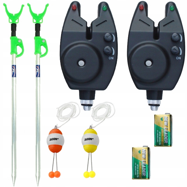 Zestaw dwóch wędkarskich sygnalizatorów brań wraz ze swingerami firmy Jaxon oraz parą podpórek pod wędziska.