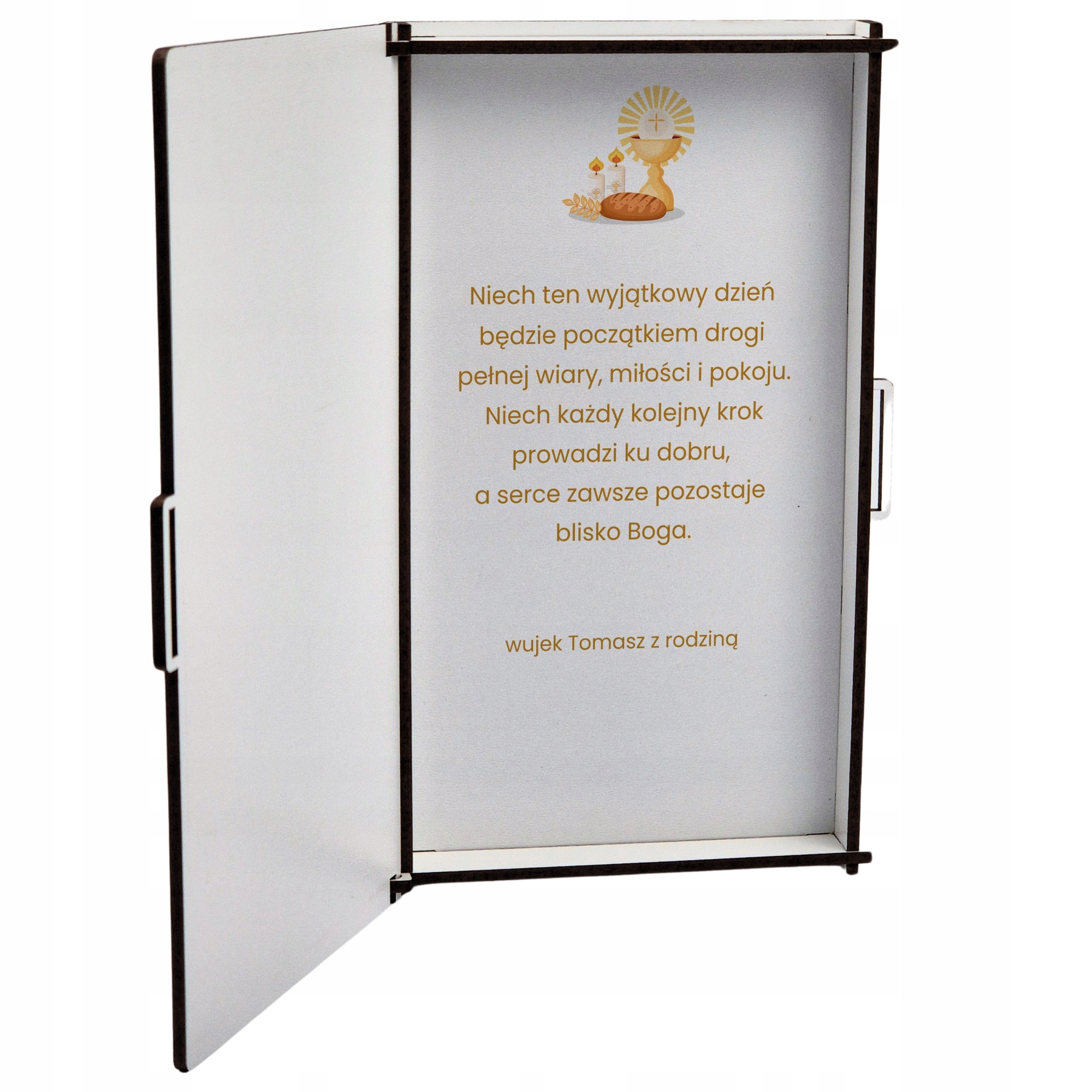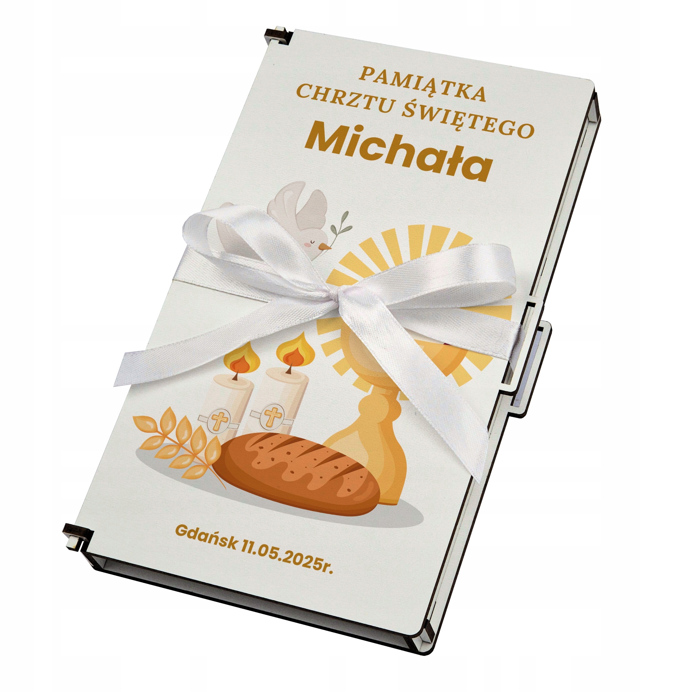 Podaruj pieniądze w elegancki i symboliczny sposób! Nasze personalizowane pudełko na Chrzest Święty to nie tylko praktyczne opakowanie na banknoty, ale również trwała i piękna pamiątka duchowej uroczystości. Wysokiej jakości biały HDF, nowoczesny nadruk UV i subtelny design sprawiają, że prezent nabiera wyjątkowego charakteru.