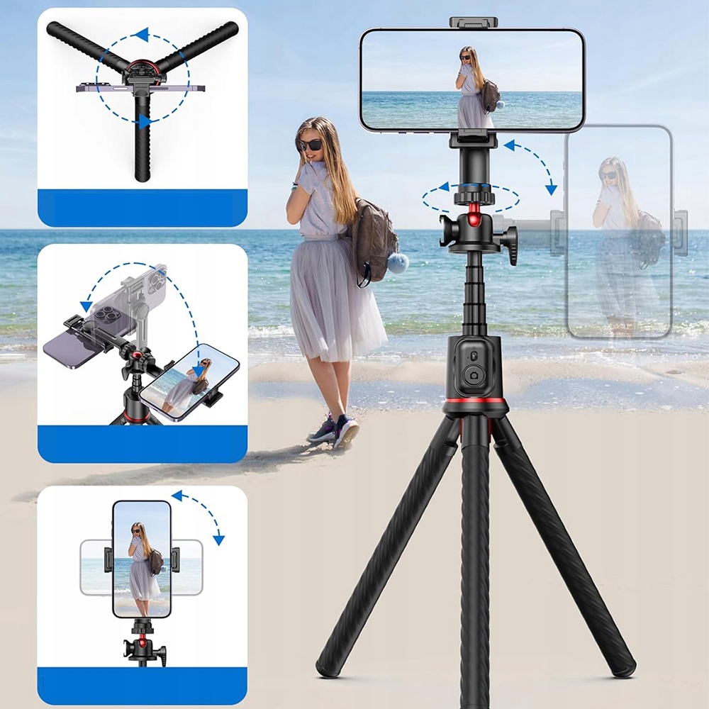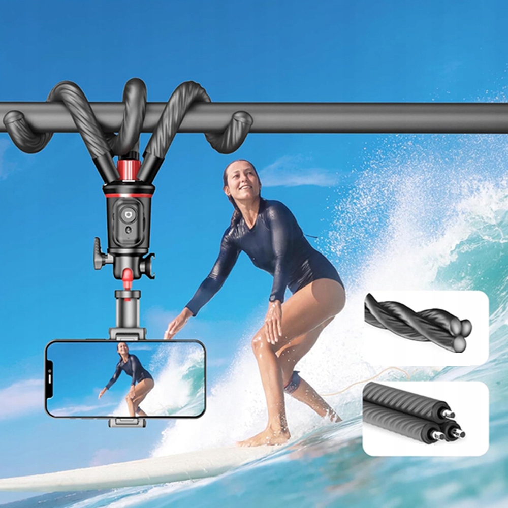 Ten wszechstronny, elastyczny statyw wyposażony jest w przedłużkę ze stopu aluminium, którą można regulować w zakresie od 46 cm (18,11 cala) do 66 cm (25,98 cala), aby dostosować go do różnych wysokości filmowania. Jego wszechstronne funkcje obejmują kijek do selfie do ręcznych kamer sportowych, umożliwiający łatwe filmowanie z pierwszej osoby; statyw stołowy zapewniający stabilne podparcie; oraz elastyczne mocowanie do owijania wokół płotów, pni drzew lub kierownic rowerowych, aby dostosować się do trudnych warunków zewnętrznych. Elastyczna regulacja pozwala na filmowanie nawet na nierównych powierzchniach, przełamując ograniczenia tradycyjnych statywów.