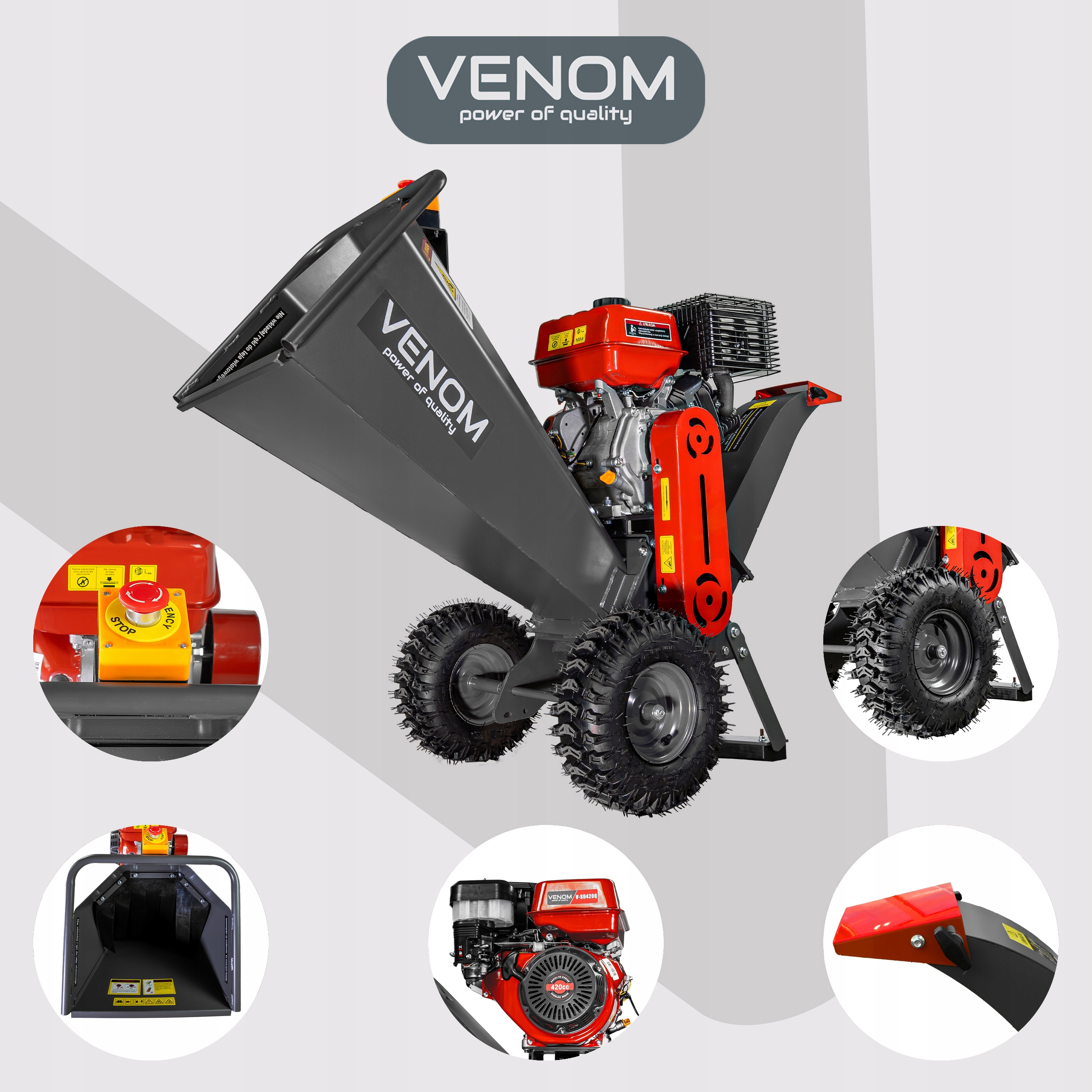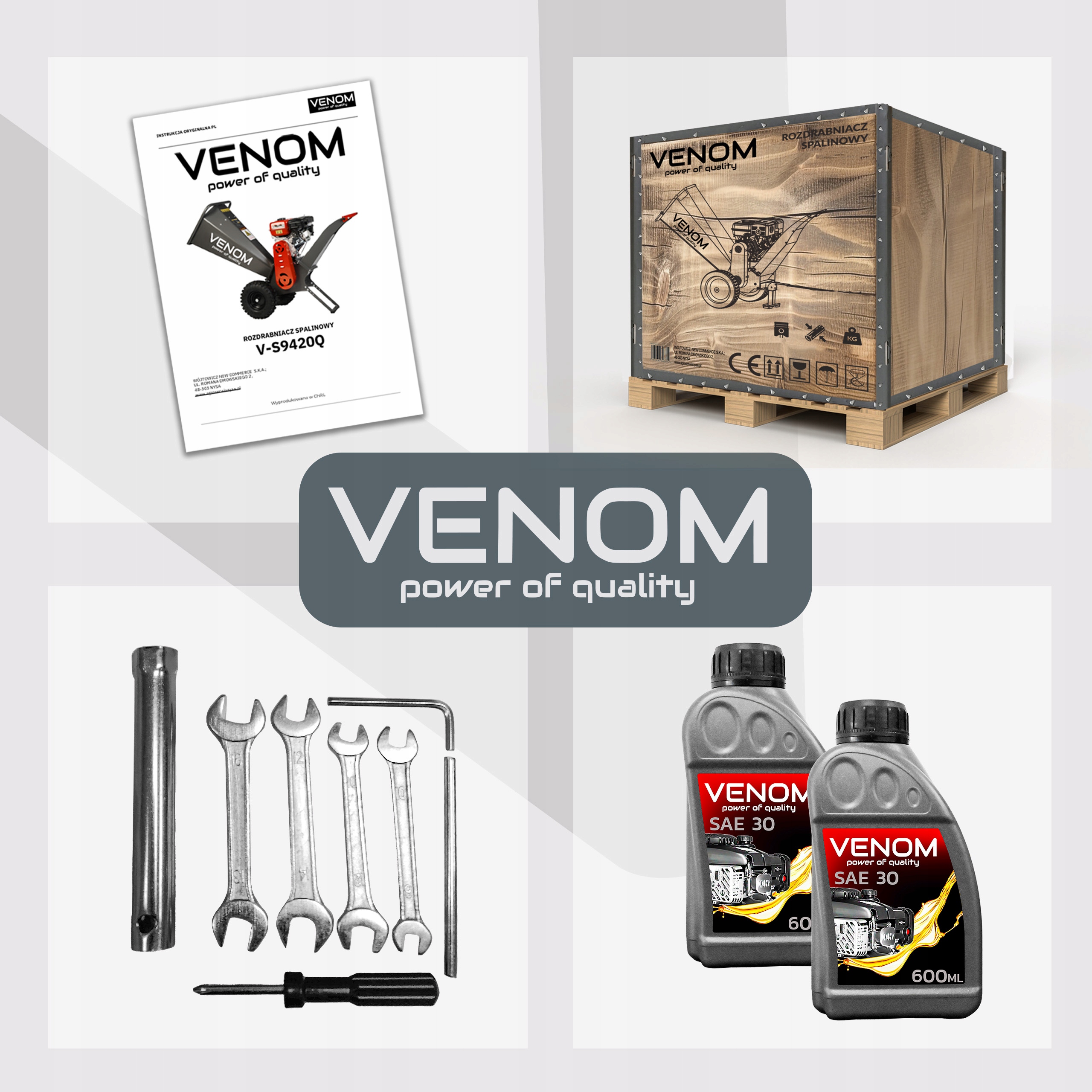 Decydując się na rozdrabniacz spalinowy VENOM, otrzymujesz kompletny, profesjonalny zestaw, który pozwala na natychmiastową i komfortową pracę – bez ukrytych kosztów i bez konieczności dokupywania akcesoriów!