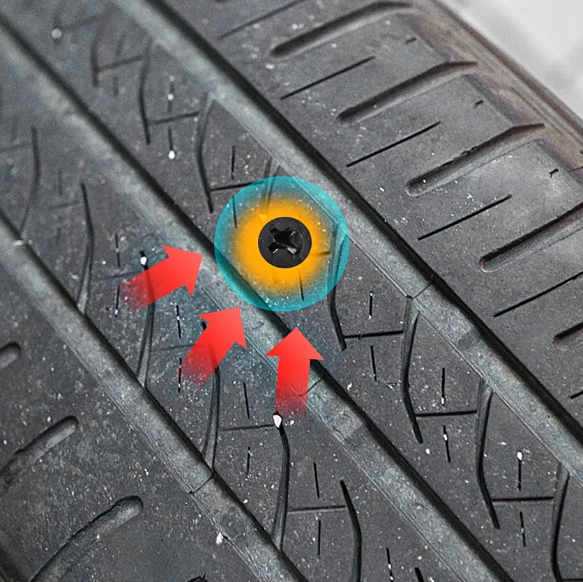 2. Posmaruj frez załączonym klejem i wbij w dziurę pozostawioną po gwoździu zgodnie z kątem pod jakim ten gwóźdź wszedł w oponę, aby dobrze wypełnić dziurę klejem.