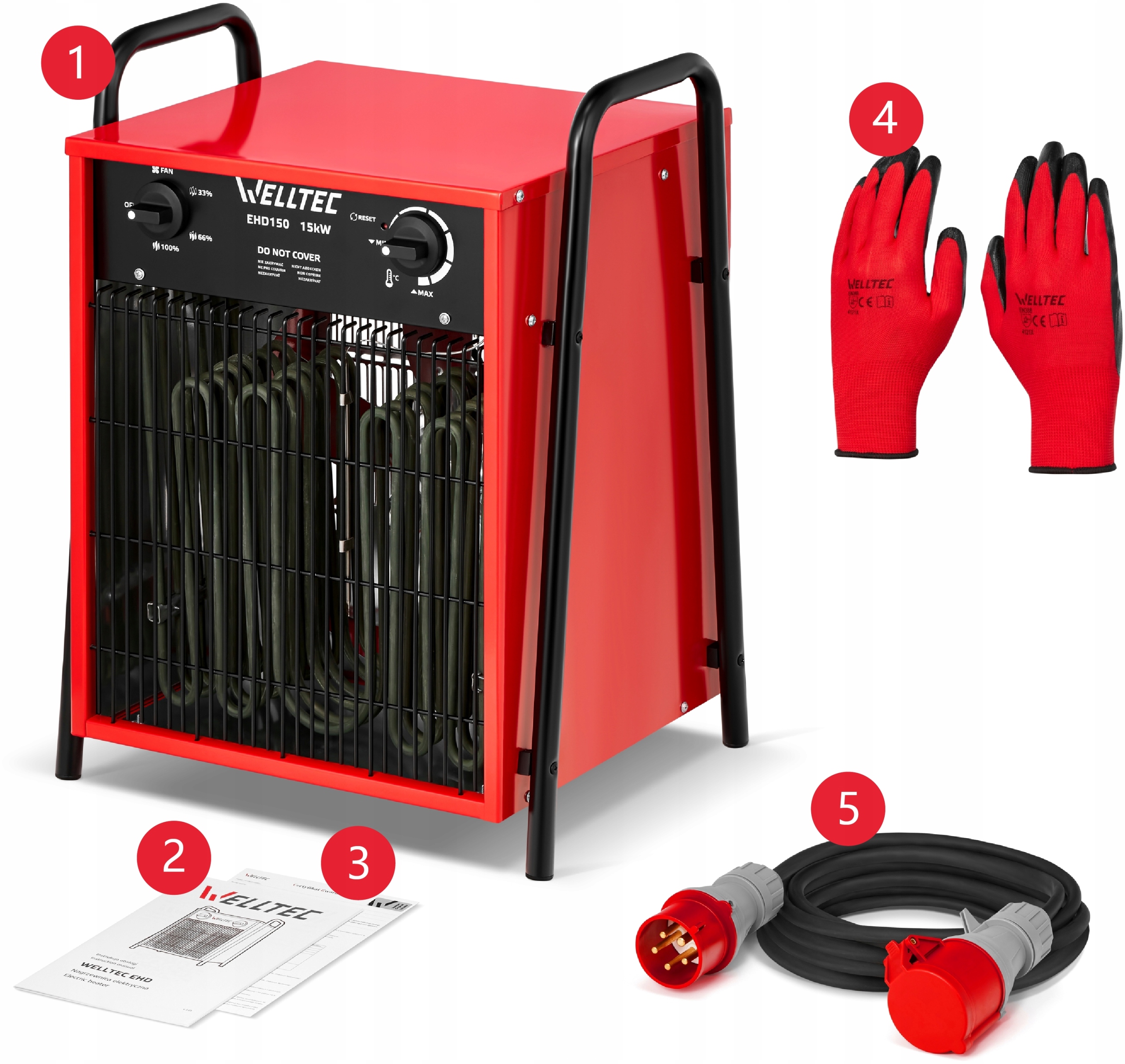 ✅ Model EHD150 zasilany jest prądem o napięciu 400V za pomocą dołączonego do zestawu przewodu pięciożyłowego o długości 2 metrów, stopniu ochrony IP44 i prądzie znamionowym 32 A. Przewody dedykowane do EHD150 można łączyć ze sobą celem uzyskania dłuższego kabla zasilającego.