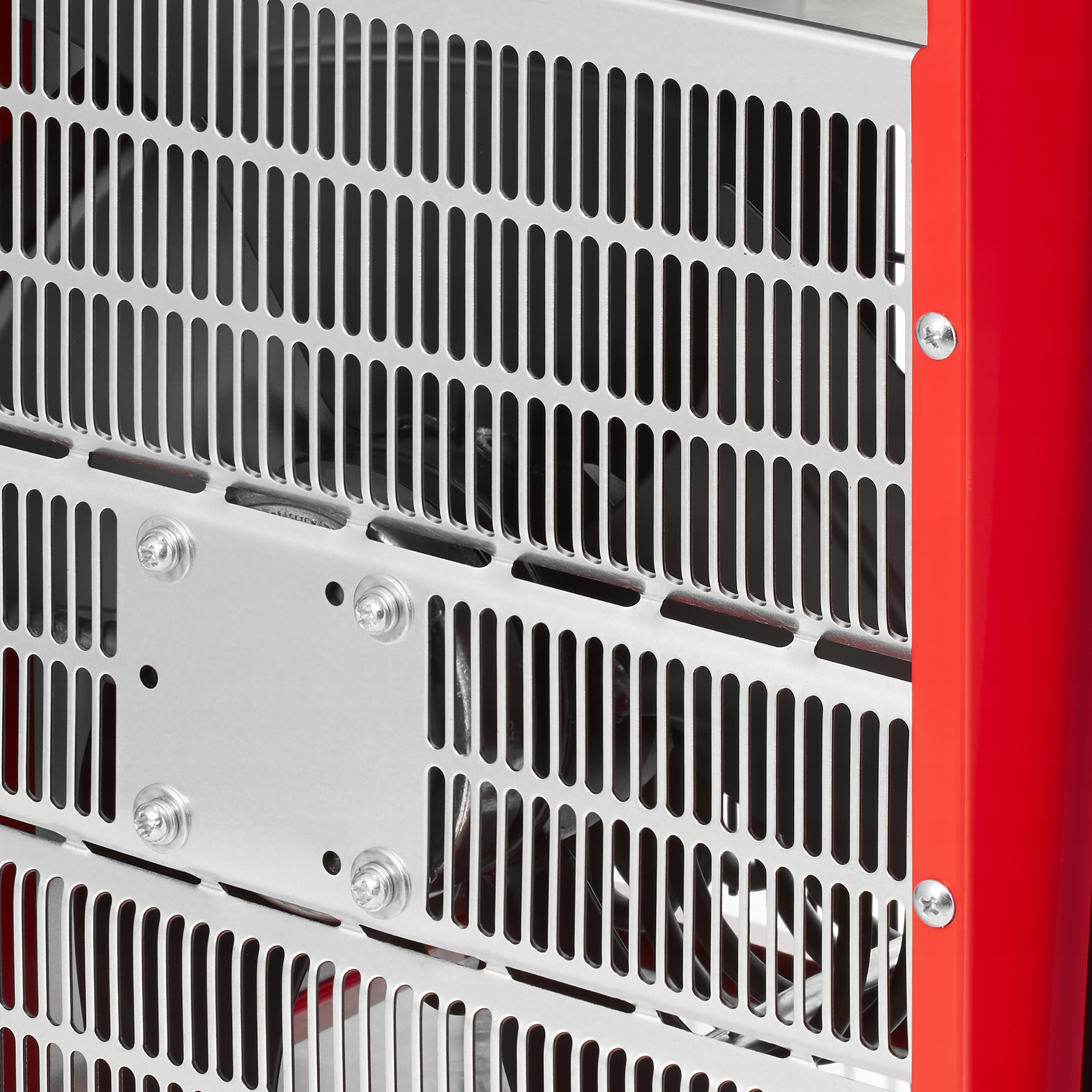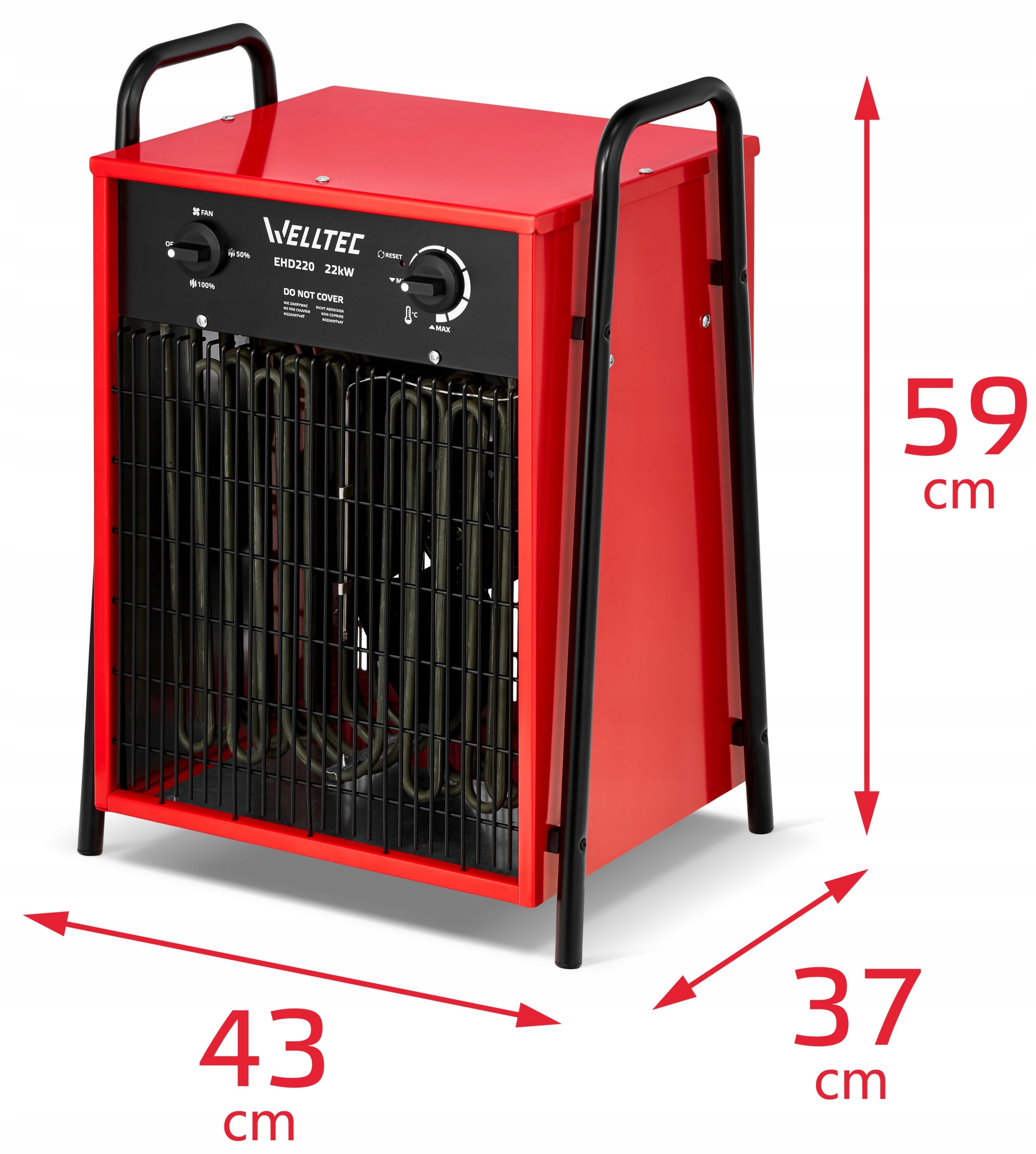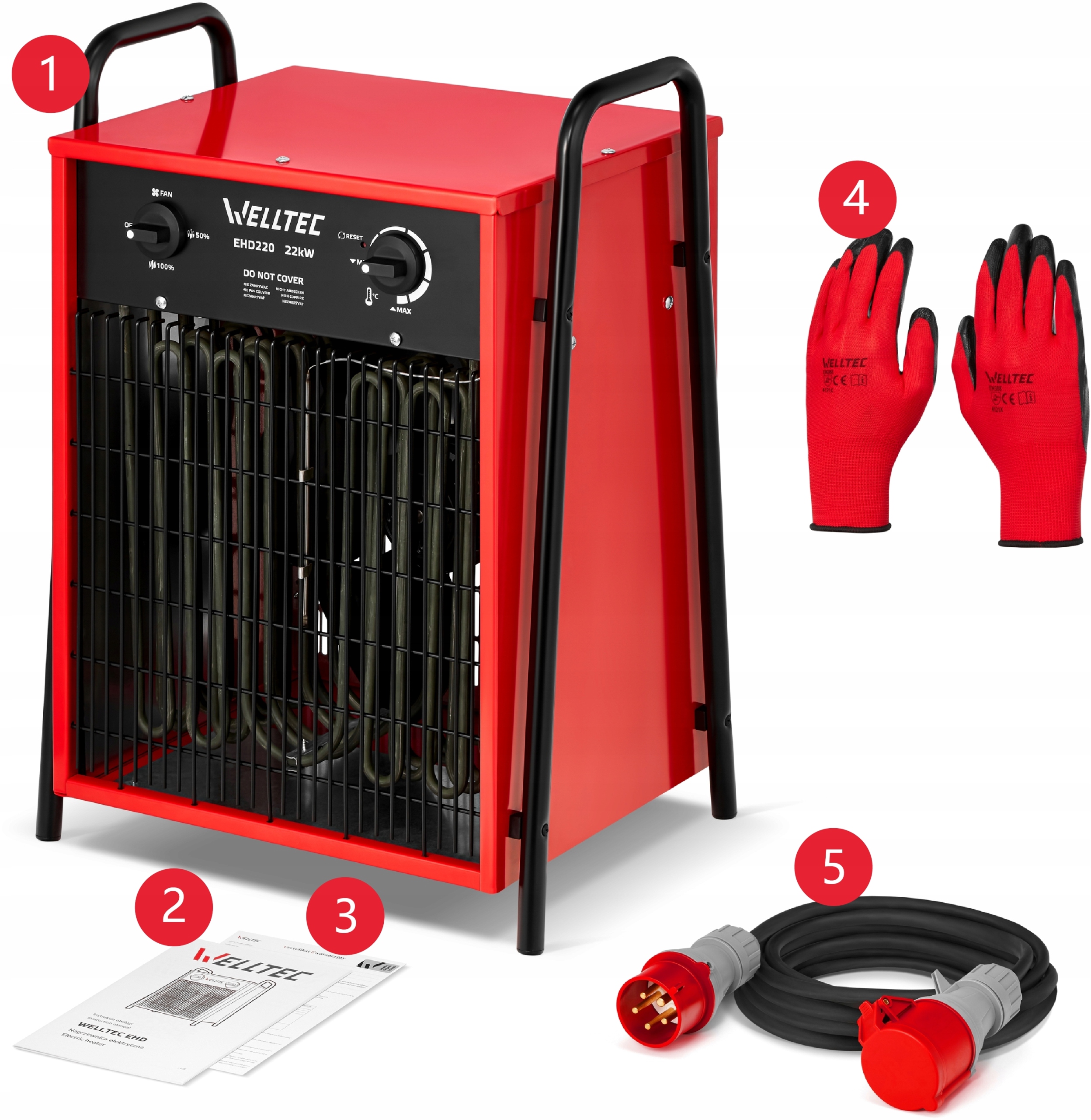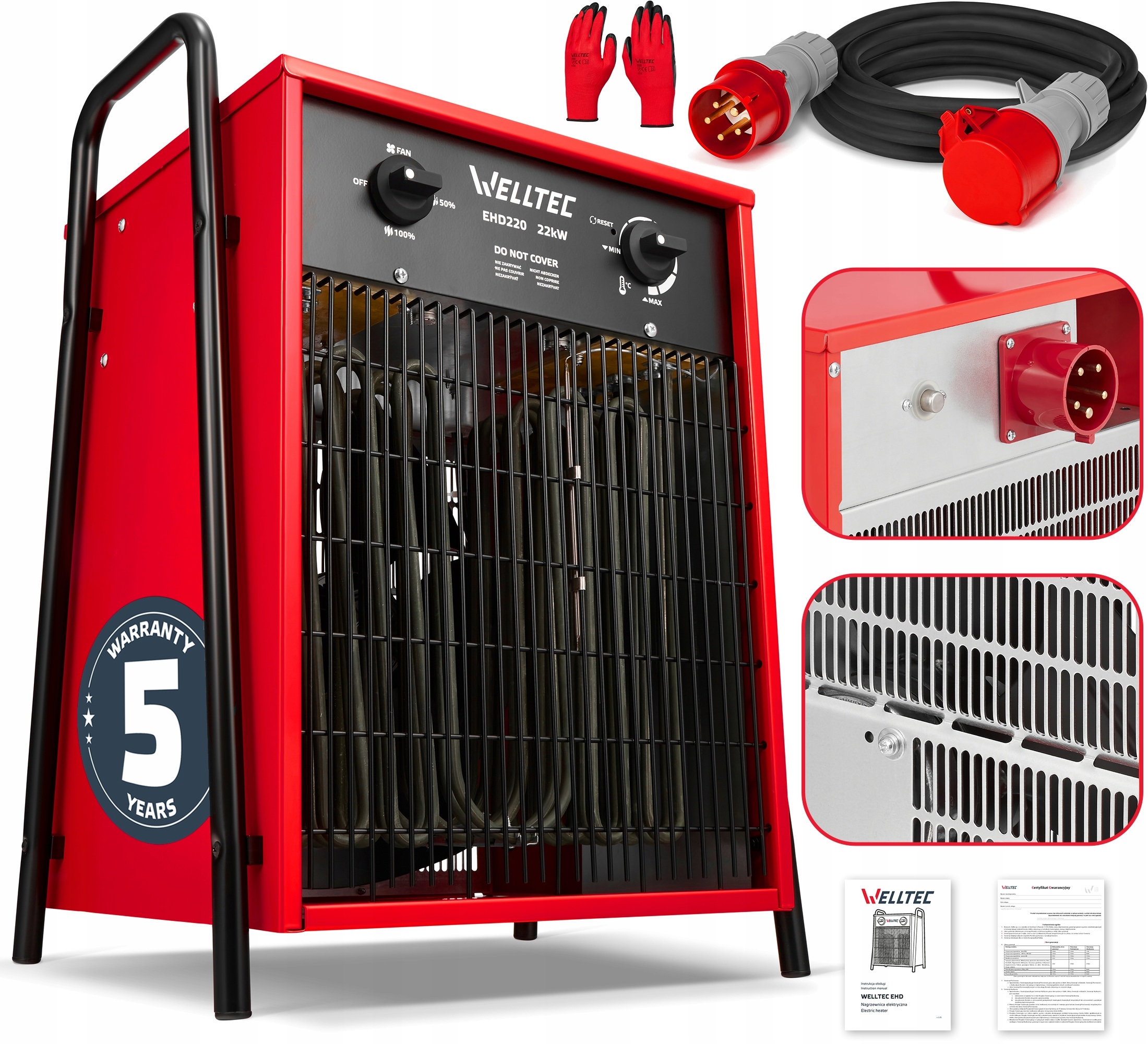 ✅ Welltec EHD220 to wydajna nagrzewnica wyposażona w sześć wytrzymałych grzałek elektrycznych generujących łącznie do 22 kW mocy grzewczej. Metalowy, pięciołopatkowy wentylator osiowy o średnicy 35 cm wytwarzający przepływ powietrza rzędu 2541 m³/h pozwala równomiernie rozprowadzić wygenerowane ciepło.