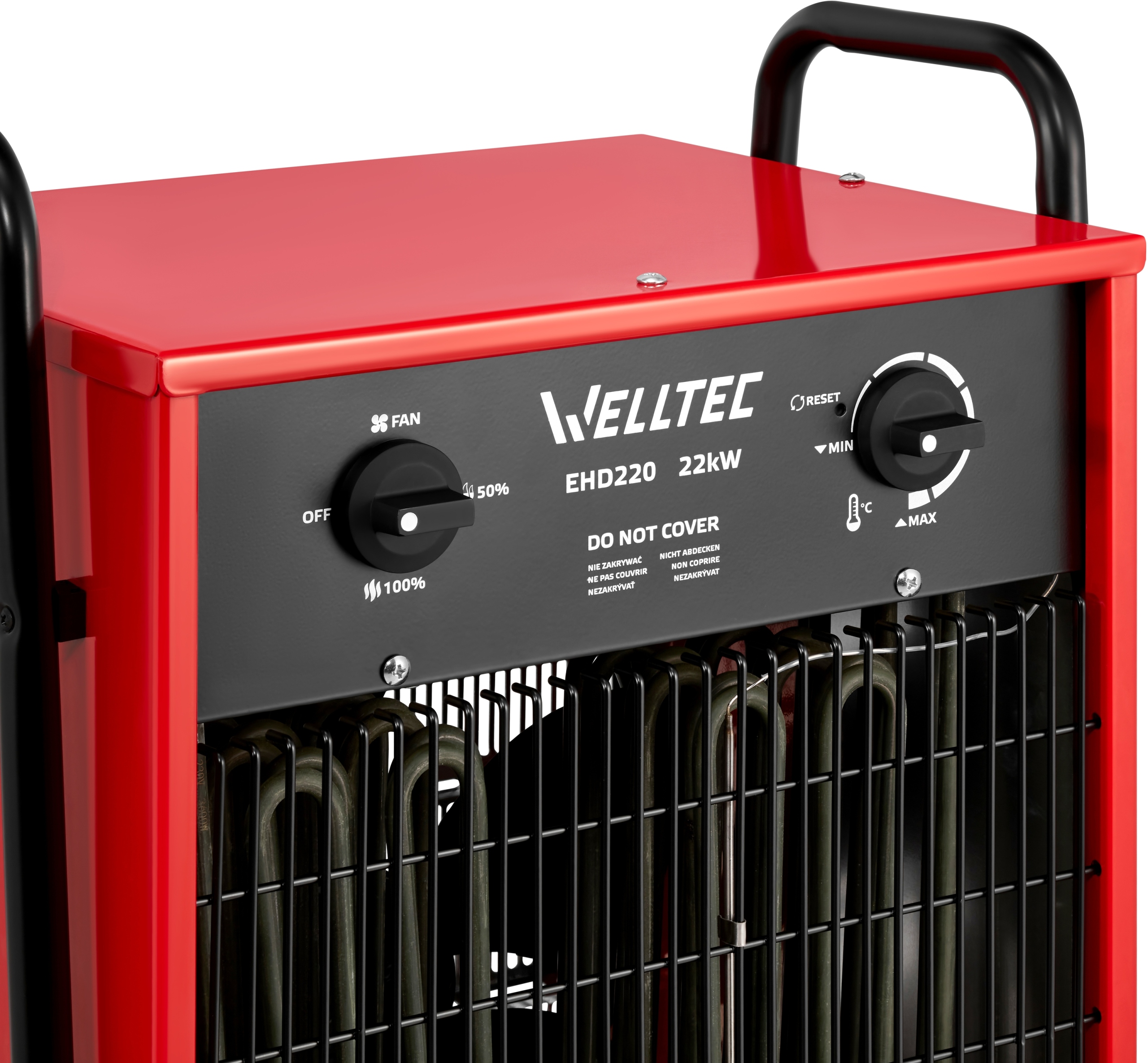 ✅ Sterowanie Welltec EHD220 jest proste i intuicyjne. Odbywa się za pomocą dwóch pokręteł na panelu sterowania. 4-pozycyjne pokrętło po lewej stronie pozwala uruchomić urządzenie i wybierać kolejno tryb wentylacji, grzania z 50% mocy (11 kW) lub grzania z 100% mocy (22 kW). Znajdujące się po prawej stronie pokrętło z płynną regulacją pozwala na precyzyjne ustawienie pożądanej temperatury termostatu w zakresie od 0 do 40°C.