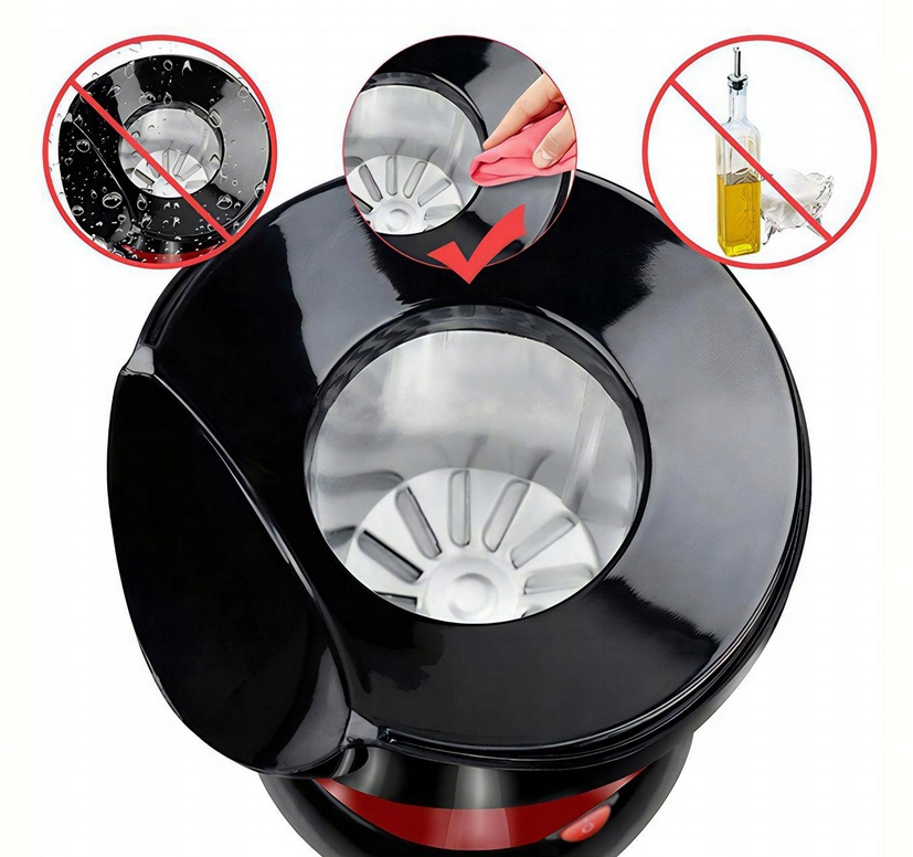 Maszynka praży ziarna kukurydzy bez tłuszczu dlatego jej czyszczenie jest niezwykle proste! Pamiętaj, żeby nie dodawać do pojemnika również cukru ani innych substancji. Po zakończeniu prażenia maszynkę z łatwością wyczyścisz przy pomocy miękkiej wilgotnej ścierki. Urządzenia nie wolno czyścić wodą ani innymi detergentami.