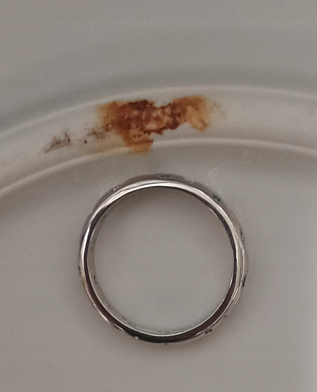 Ma około centymetrowy ślad rdzy, poza tym normalne ślady użytkowania, ale bez pęknięć i uszczerbków.