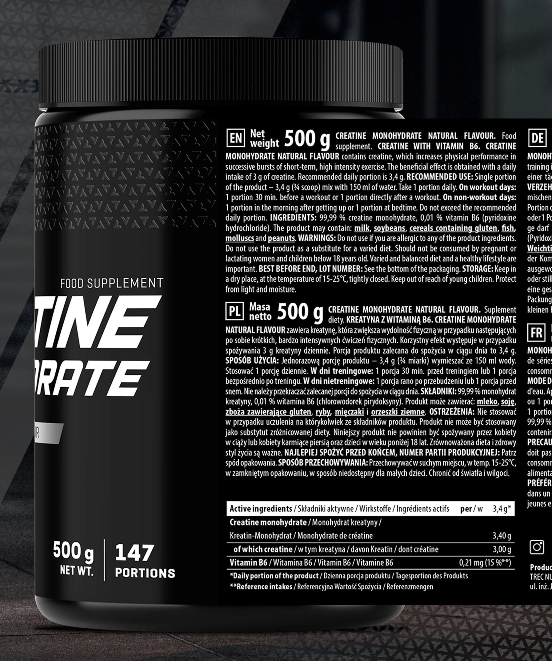 SKŁADNIKI: 99,99 % monohydrat kreatyny, 0,01 % witamina B6 (chlorowodorek pirydoksyny). Produkt może zawierać: