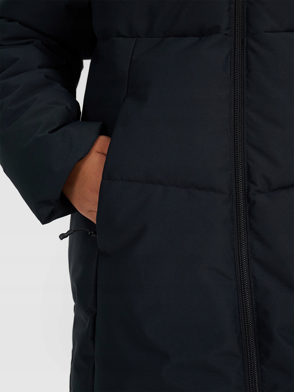 Przedłużony krój do kolan i hydrofobowa impregnacja zwiększają ochronę w chłodniejsze dni. Kaptur z elastyczną wyściółką i wysoki kołnierz skutecznie osłaniają przed wiatrem. Kurtka ma 2 kieszenie zapinane na zamek oraz rękawy z mankietami bez regulacji.