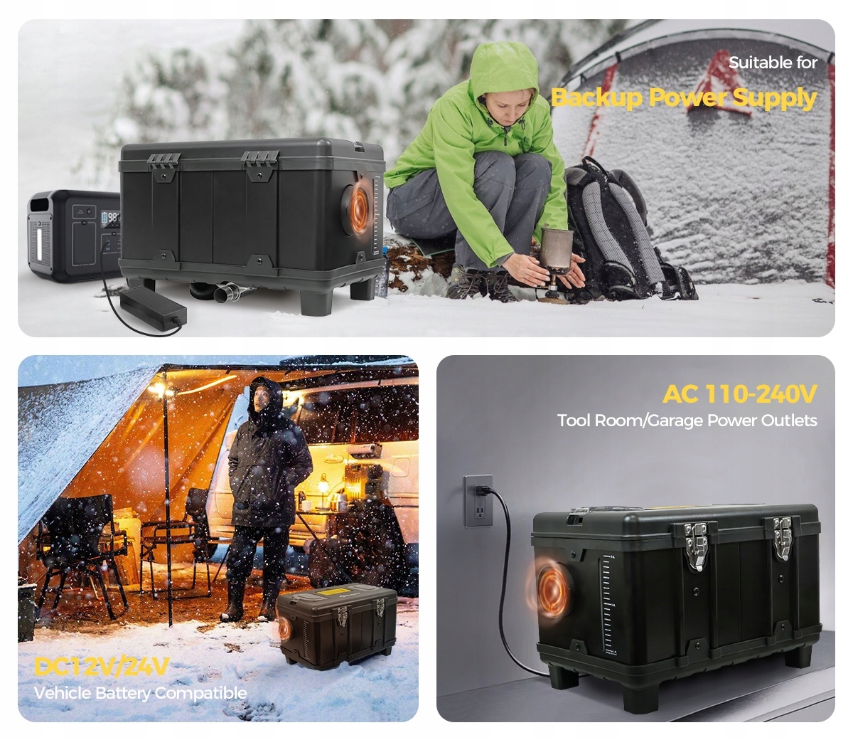 ✅ Szeroka kompatybilność (DC 12V & 24V, AC 110-240V) – możliwość podłączenia do gniazdka, akumulatora pojazdu lub przenośnej stacji zasilania.