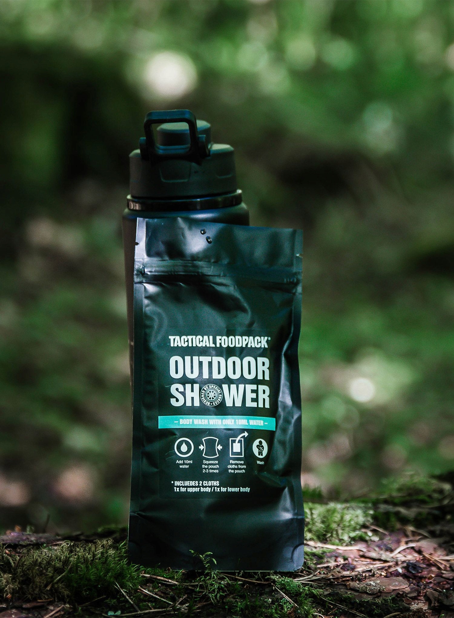 Zestaw turystyczny Tactical Foodpack Outdoor Shower to sposób na umycie ciała w plenerze, gdy dostęp do wody jest ograniczony. Wystarczy tylko 10 ml wody, by nawilżyć ściereczki z pantenolem, które oczyszczą skórę i złagodzą podrażnienia.