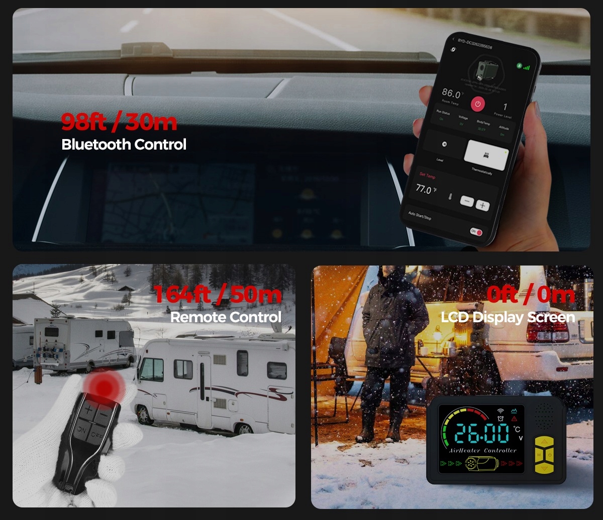 ✅ Trzy sposoby sterowania – aplikacja Bluetooth, pilot zdalnego sterowania (50 m) oraz panel LCD.