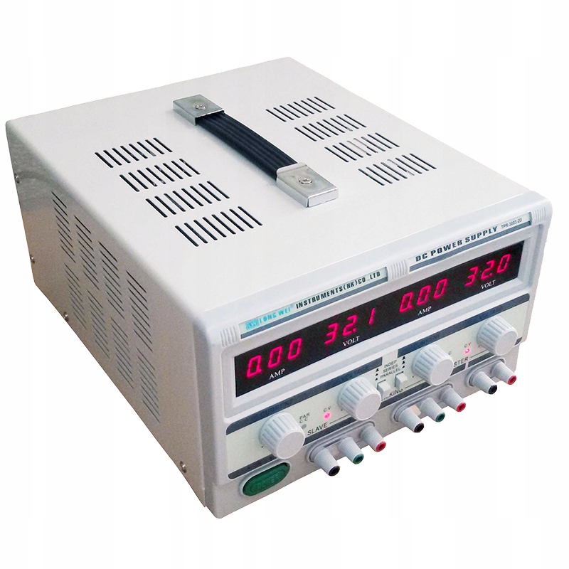 TPR3005-2D to zasilacz laboratoryjny produkcji Long Wei 30V 5A 300W to zasilacz laboratoryjny potrójny, czyli o 3 wyjściach napięcia. Dwa kanały wyjściowe SLAVE(1) i MASTER(2) zasilacza TPR3005-2D są niezależne. Możliwa jest w nich płynna regulacja napięcia w zakresie od 0 do 30V z wydajnością prądową do 5A. Regulacja napięcia i prądu w tych kanałach wyjściowych jest niezależna tzn. w pierwszym kanale możemy ustawić wartość napięcia wyjściowego 5,2V natomiast w w drugim kanale 30,0V. Maksymalna wydajność prądowa zasilacza TPR3005-2D w kanale 1 i 2 wynosi 5A w całym przedziale wartości napięcia wyjściowego. W zasilaczu laboratoryjnym TPR-3005-2D możliwe jest łączenie równoległe lub szeregowe wyjść 1 i 2 w celu uzyskania zwiększenia wydajności prądowej lub zwiększenia zakresu napięcia wyjściowego.