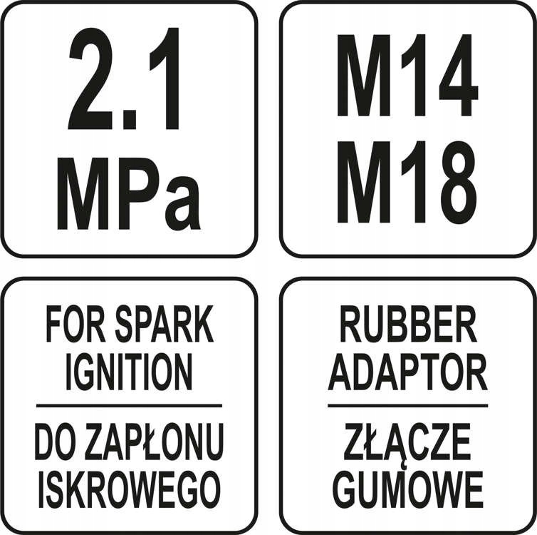 Pięcioczęściowy zestaw przeznaczony do pomiaru ciśnienia sprężania w silnikach z zapłonem iskrowym. Polecany do serwisów samochodowych i mechanicznych.