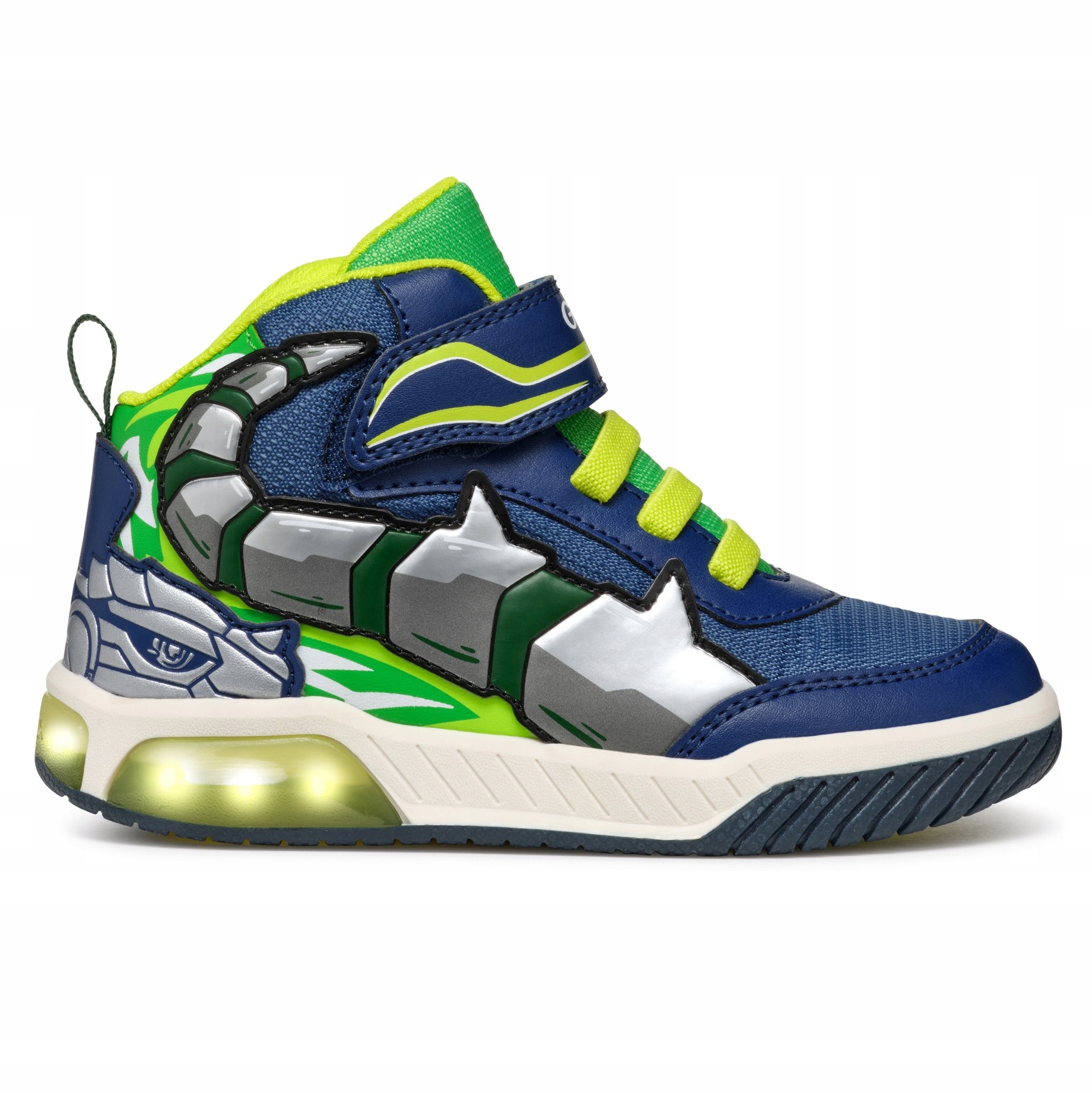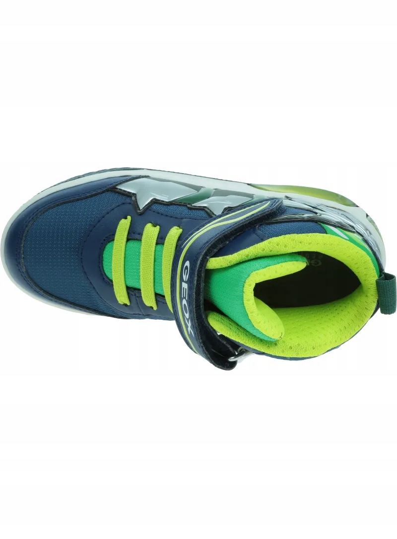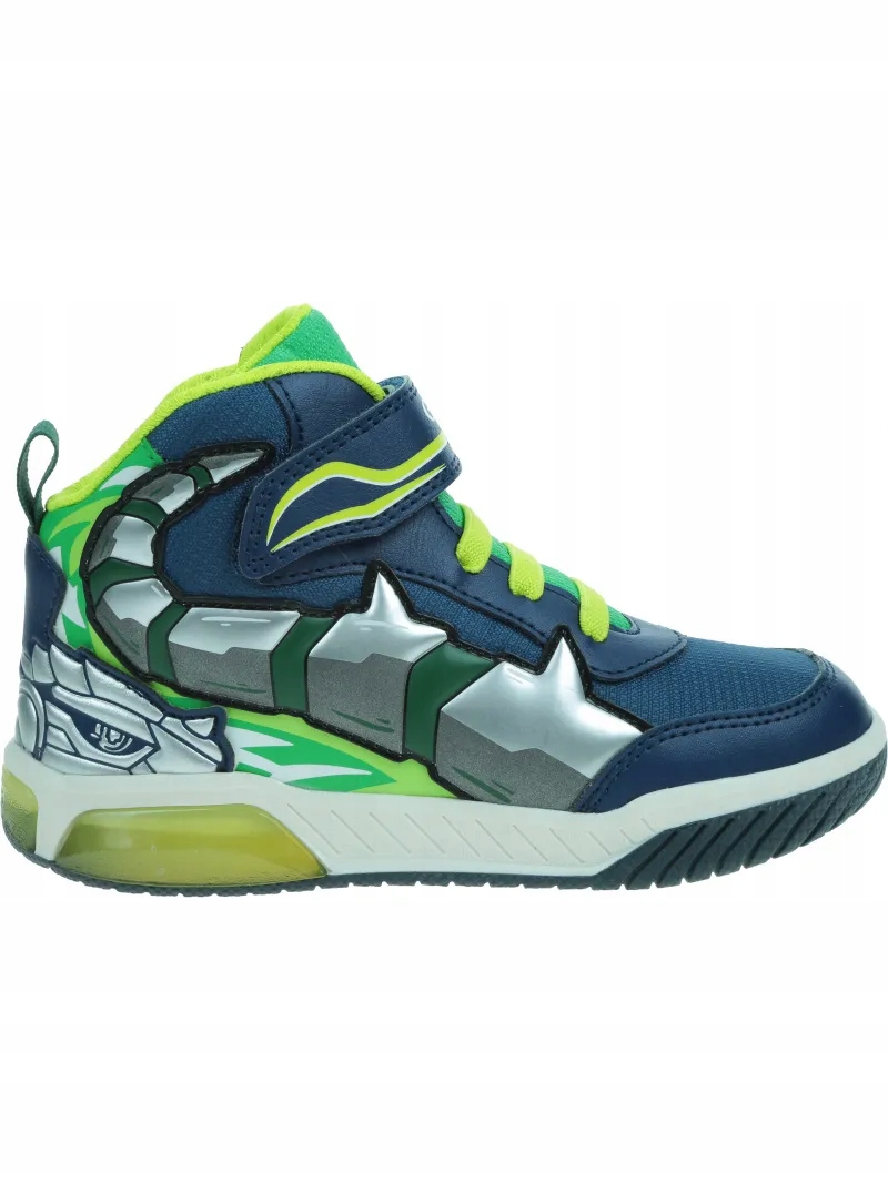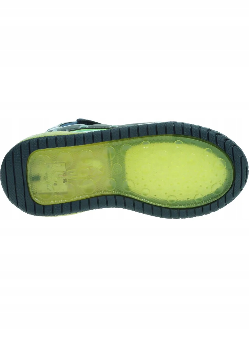Średnio wycięte sportowe buty dla chłopców z migoczącymi światłami wbudowanymi w przezroczystą podeszwę. Ta wersja Inek w granatowo-limonkowej kolorystyce wyróżnia się odważnymi wzorami nadruku na cholewce i z pewnością doda energii każdemu wyglądowi dzięki sportowemu charakterowi. Wykonane z tkaniny i materiału imitującego skórę, to wygodne, oddychające obuwie zostało zaprojektowane tak, aby bawić dzieci podczas chodzenia.