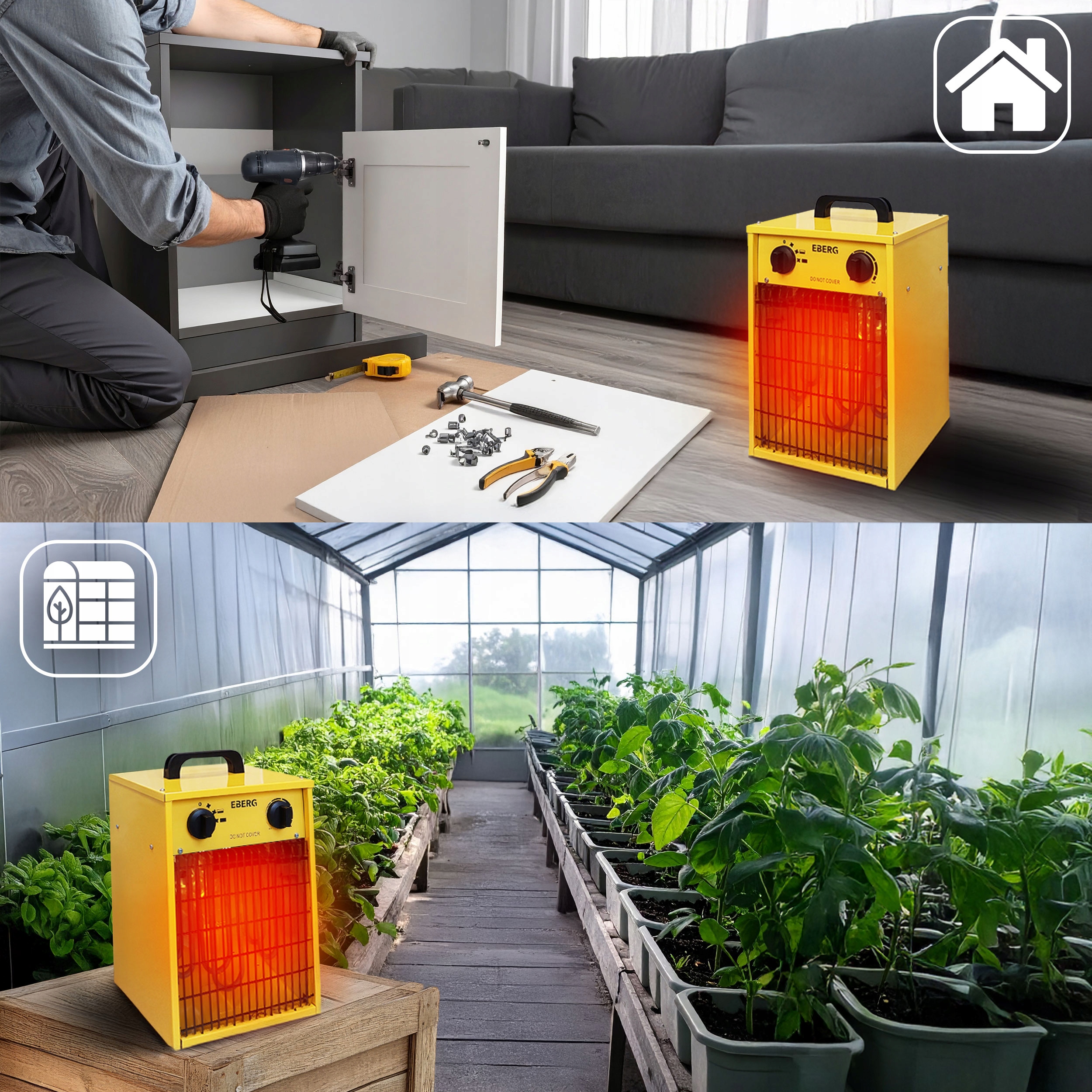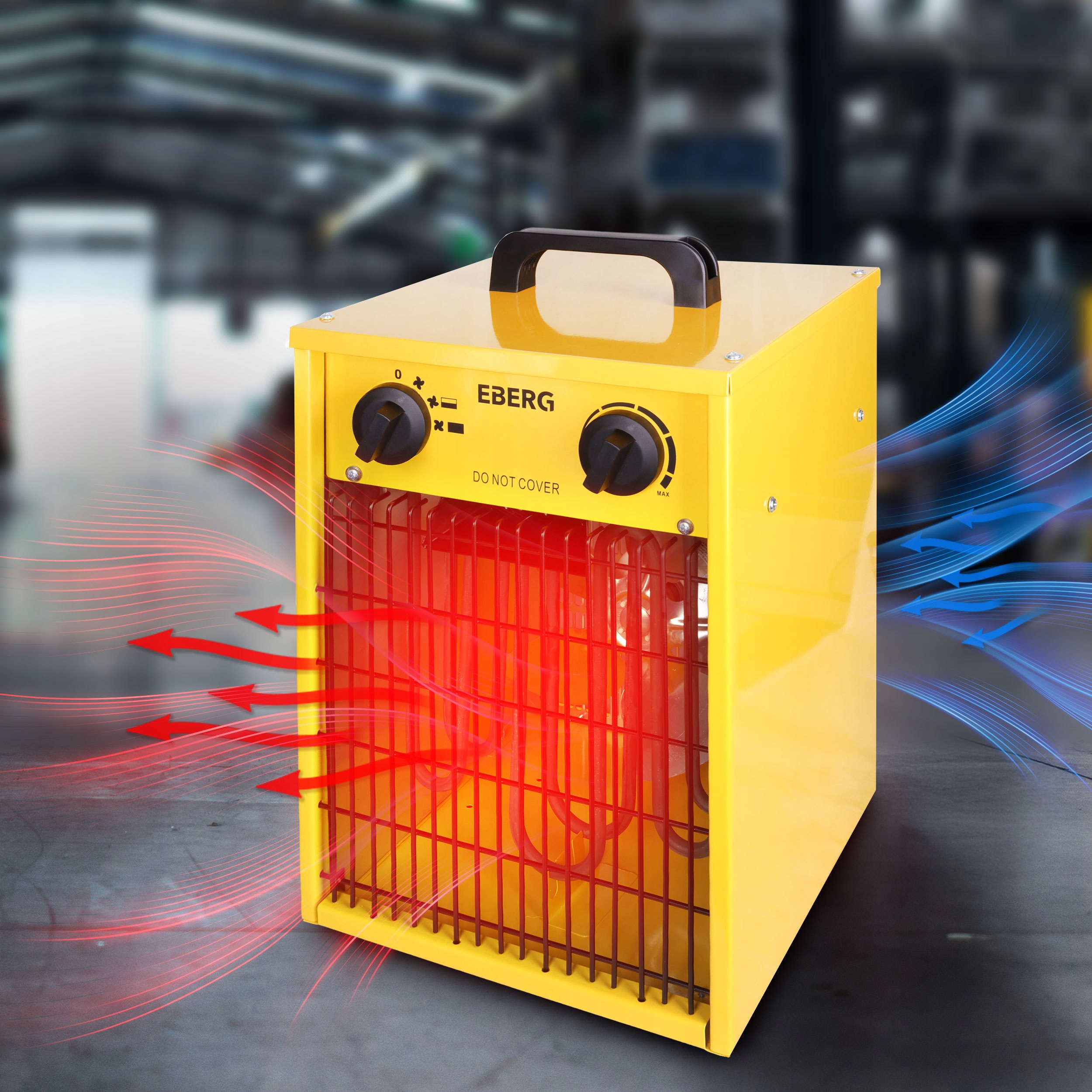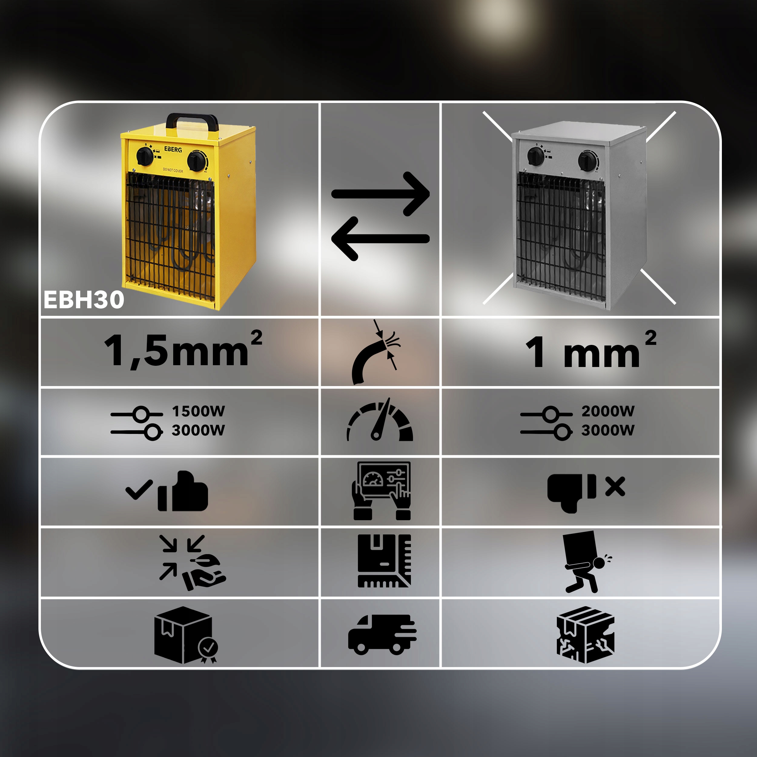 Nagrzewnice EBERG® EBH to doskonałe urządzenia do dogrzewania stanowisk pracy – wentylator szybko i równomiernie rozprowadza ciepło, co zwiększa komfort i daje realne oszczędności, bo efekt ogrzewania odczuwalny jest natychmiast, bez wielogodzinnego nagrzewania pomieszczenia.