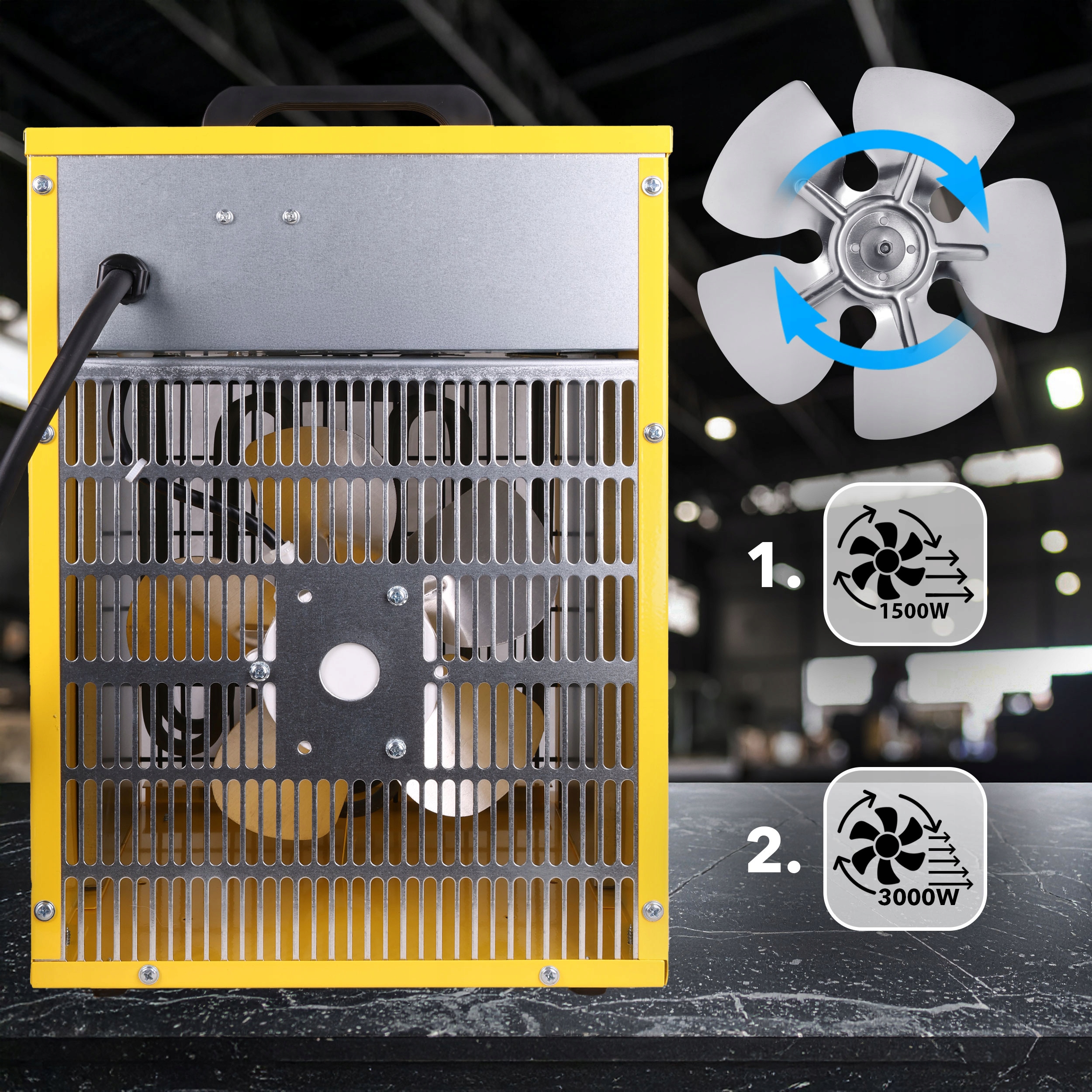 Do wyboru masz dwa tryby grzania: ekonomiczny 1500 W i pełną moc 3000 W, dzięki czemu dopasujesz działanie do swoich potrzeb. Co więcej, zintegrowany wentylator może pracować także bez funkcji grzania, zapewniając efektywną cyrkulację powietrza.