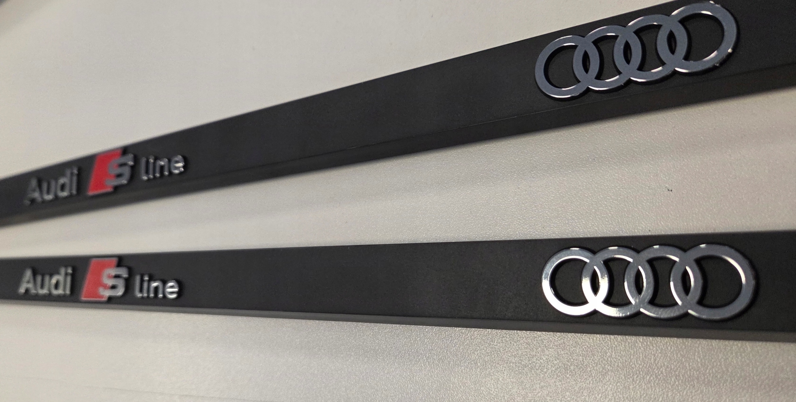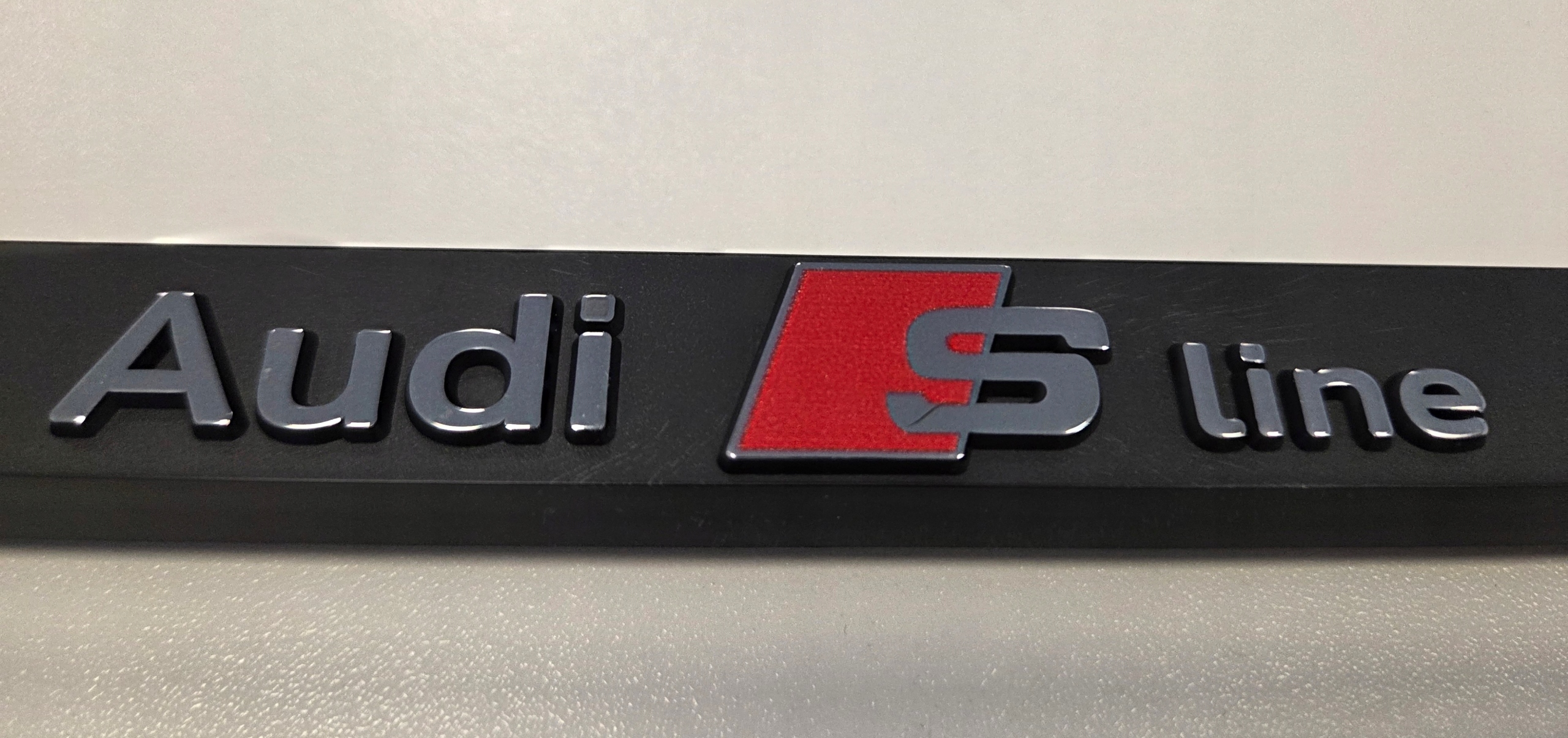 Listwy zdobią wypukłe chromowane napisy 3D S-line oraz emblemat marki Audi