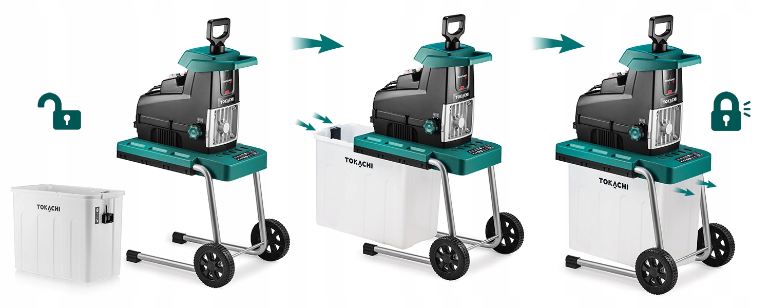 Rozdrabniacz frezowy z koszem | Średnica gałęzi aż 44 mm | Wpinany kosz (box) o pojemności aż 60 l | Moc max 3500 W | Sekator w zestawie | Uchwyt na popychacz | Prędkość obrotowa 60 rpm | Bardzo cichy | Energooszczędny | Panel sterowania | Zabezpieczenie przed przeciążeniem | Bieg wsteczny | Hamulec bezpieczeństwa | Uchwyt transportowy | Duże koła