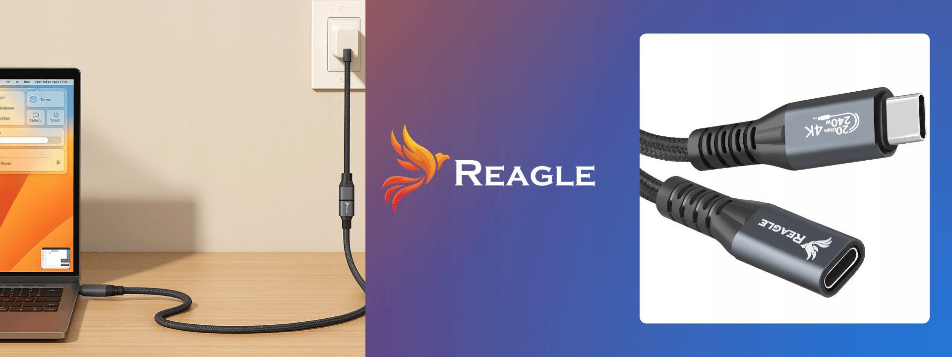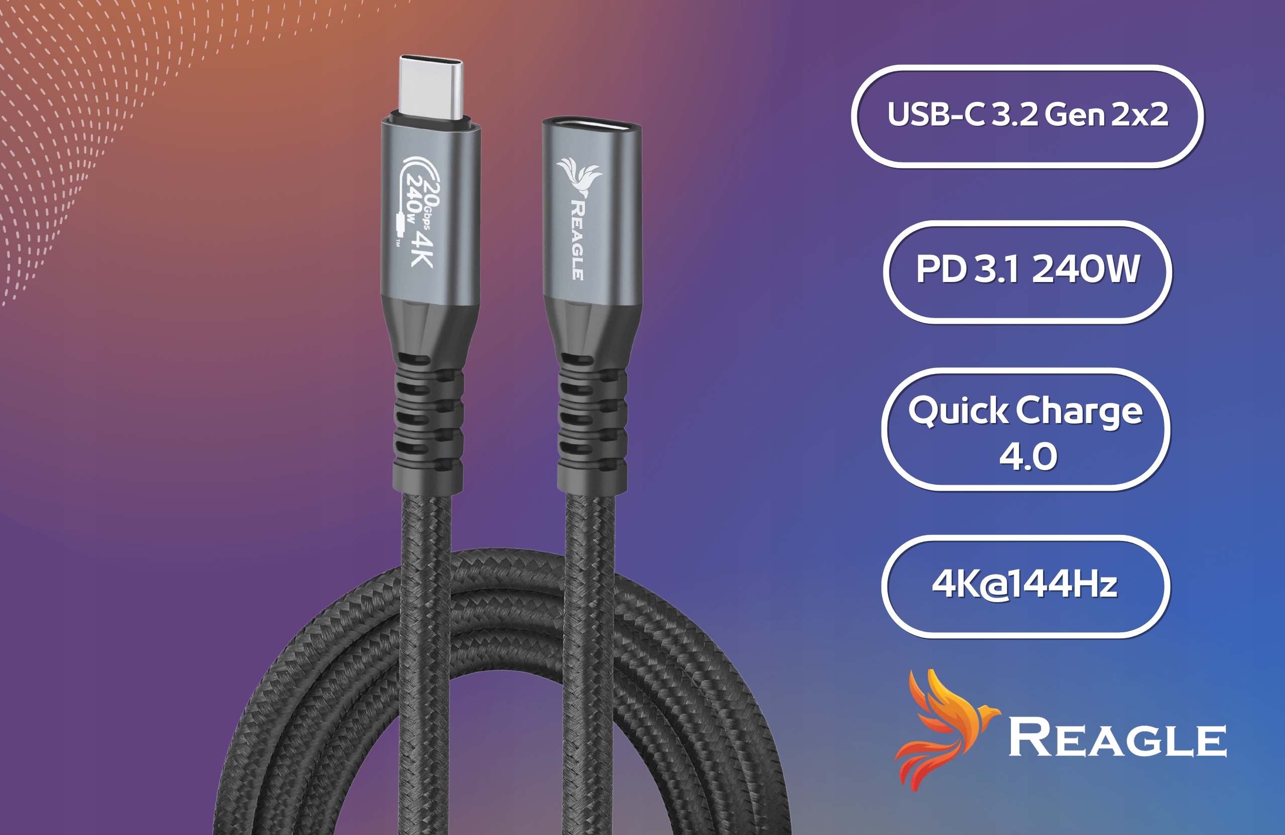 Model RPC500P od marki Reagle to nowoczesny przedłużacz USB-C Z mocą ładowania aż 240W, który nie tylko rozwiązuje problem zbyt krótkiego kabla, ale oferuje też ogromną wydajność, prędkość transferu do 20 Gb/s i obsługę wideo 4K@144Hz.