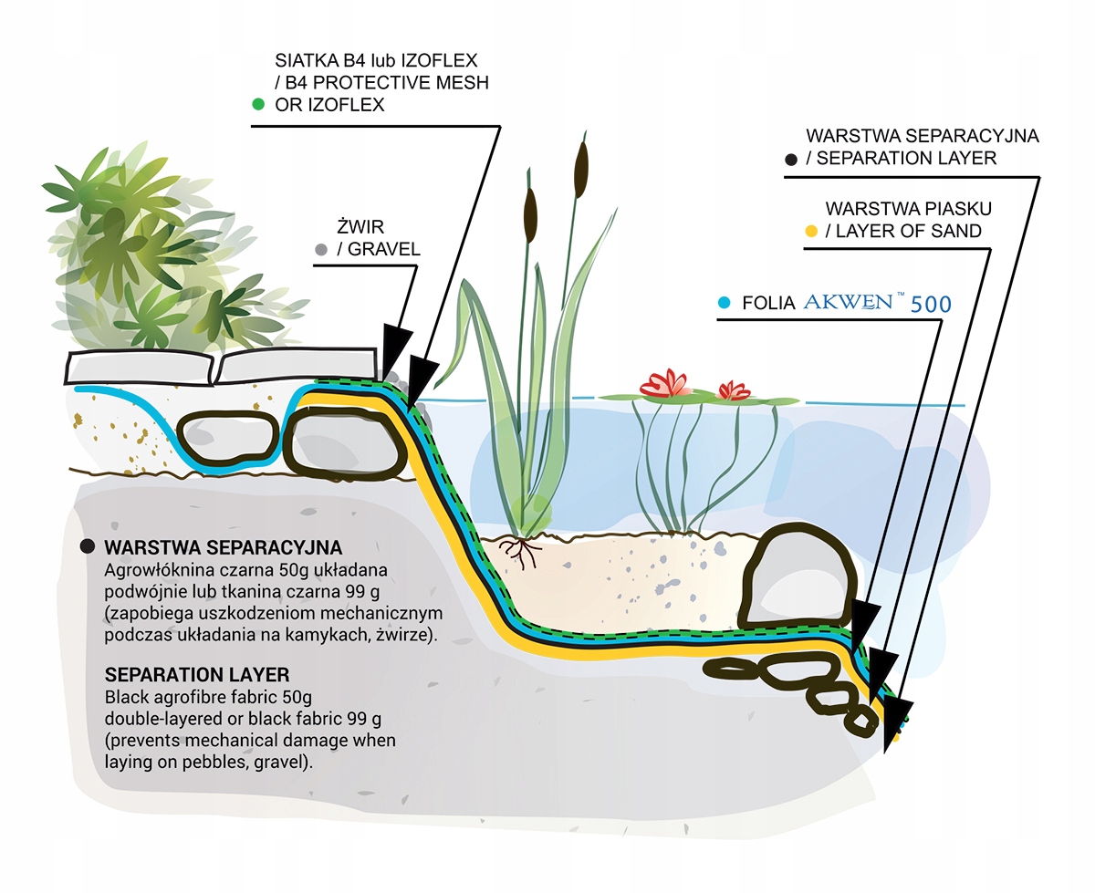 Folie basenowe to grupa trzywarstwowych folii, umożliwiająca stworzenie łatwo i niedrogo własnego stawu w ogrodzie. Planując samodzielną budowę oczka wodnego należy zacząć od wyznaczenia granic zbiornika. Można to zrobić przy pomocy drewnianych kołków połączonych sznurkiem lub kolorową wstążką (będzie widoczna z różnych części ogrodu, co ułatwi ustalenie optymalnego kształtu, zanim zaczniemy kopać). Ściany zbiornika nie powinny być proste, należy zachować pewien kąt spadku dna, a także pamiętać o wyprofilowaniu "półek" dla roślinności. Dno zbiornika należy oczyścić z kamieni, szkła, patyków mogących uszkodzić folię, a następnie wysypać kilkucentymetrową warstwę piasku. Na tak przygotowane podłoże można układać folię basenową . Układanie folii powinno odbywać się przy słonecznej pogodzie, przy temperaturze powyżej 20 stopni Celsjusza. Rozciągamy ją nad wykopem, a następnie opuszczamy tak, aby najpierw dotknęła dna w najgłębszej części zbiornika. Układanie prowadzimy od dołu ku górze. Nie należy naciągać folii, powinna ona leżeć swobodnie.