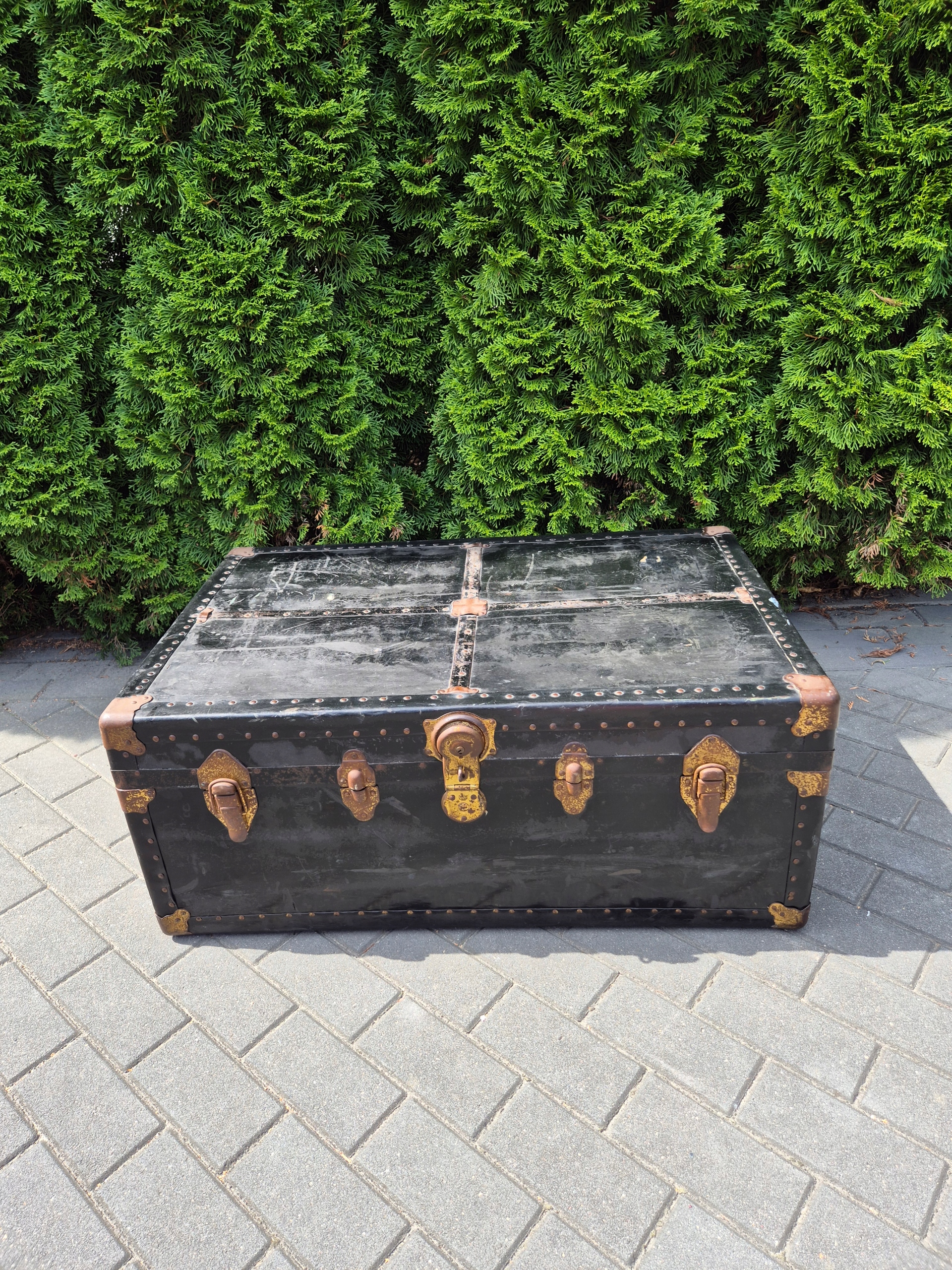 Duży, czarny kufer podróżny z metalowymi okuciami i zamknięciami. Wewnątrz wyłożony papierem w geometryczny wzór. Solidny, klimatyczny przedmiot – idealny jako element wystroju wnętrz, do przechowywania lub dekoracji.