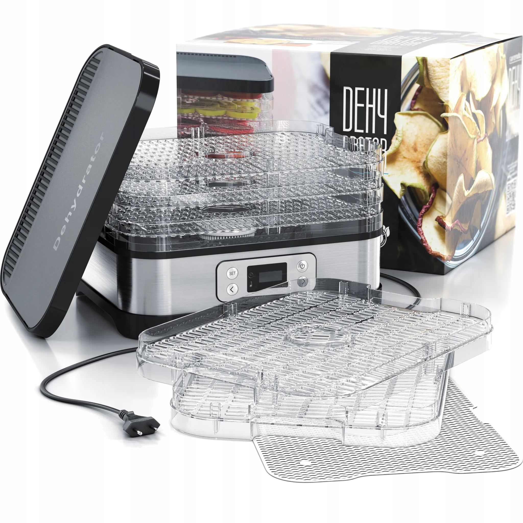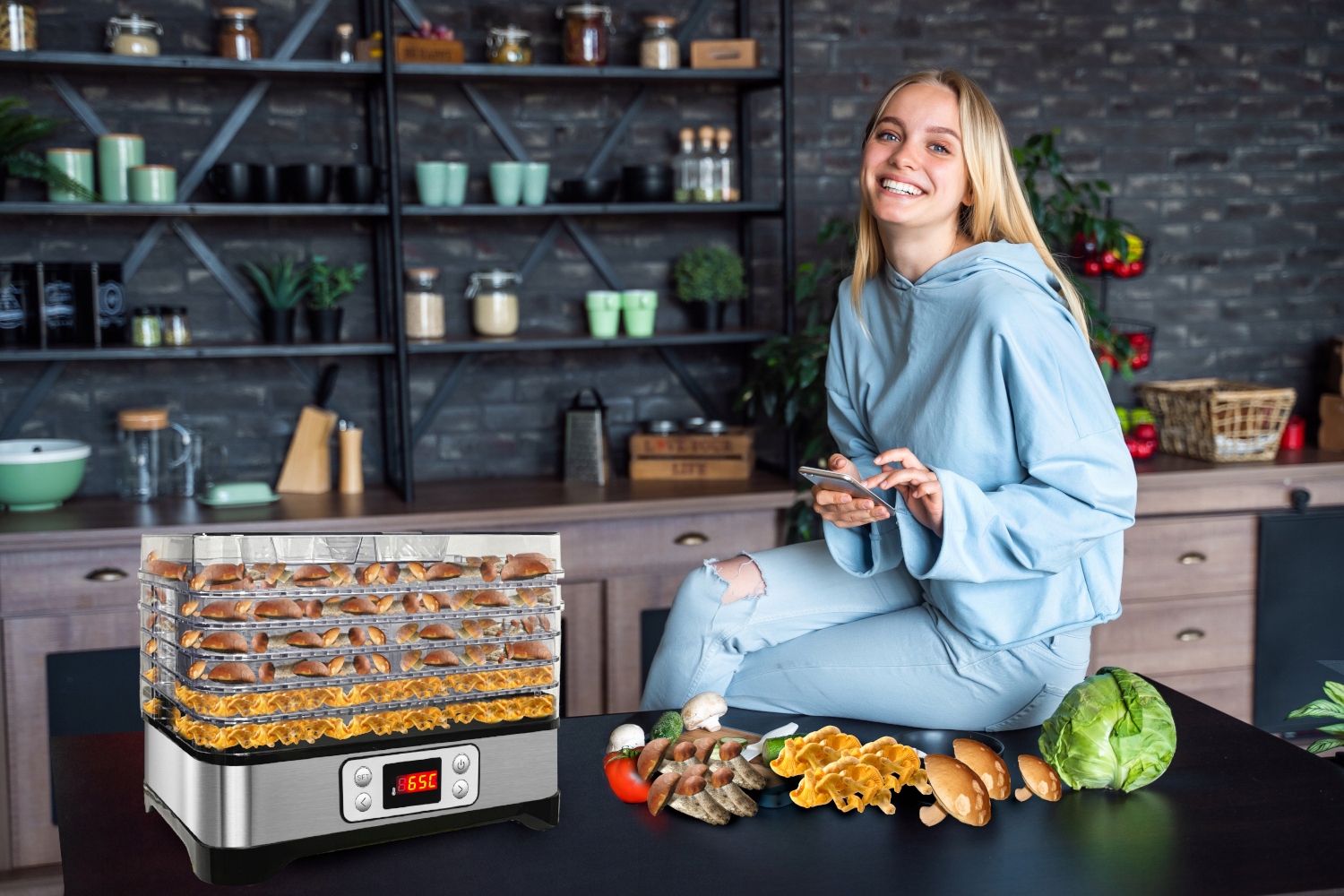 Moc 500 W z termoobiegiem gwarantuje szybkie i równomierne suszenie, a pojemność 12 L oraz 5 dwustronnych sit o regulowanej wysokości zapewniają miejsce na duże porcje.