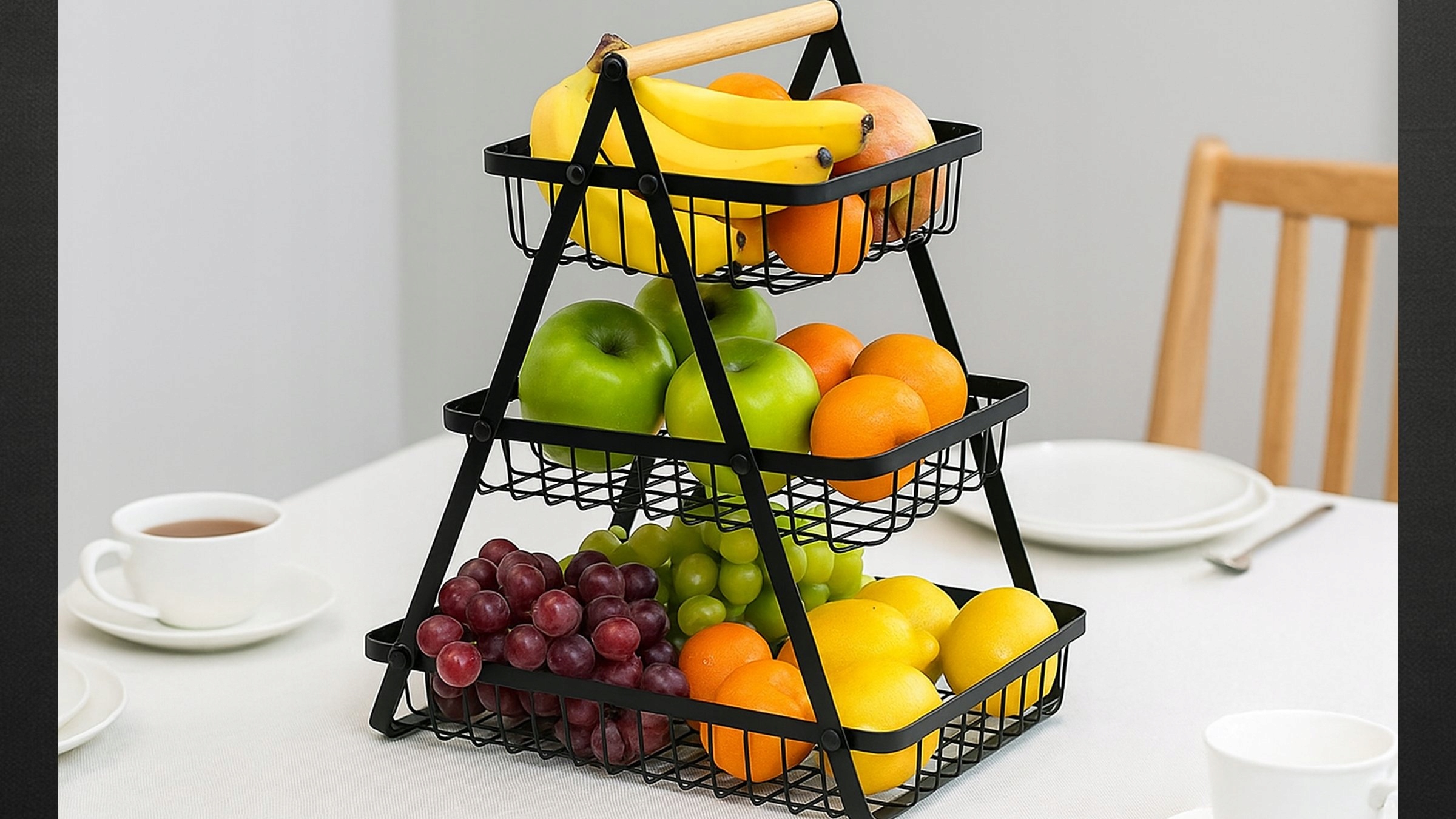 🔸 Trzypoziomowa konstrukcja – Dzięki aż trzem poziomom, koszyk pozwala na efektywne zagospodarowanie przestrzeni i wygodne przechowywanie większej ilości owoców i warzyw. Doskonale sprawdzi się w każdej kuchni, niezależnie od jej wielkości, pomagając w utrzymaniu porządku. 🍏🍊
