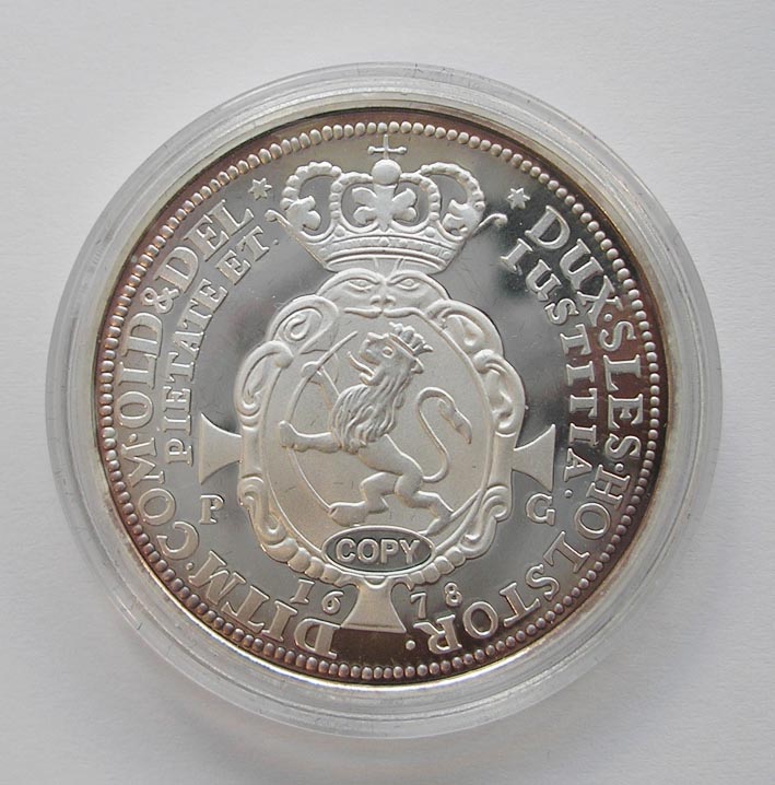 Kopia wykonane ze srebra pr.0,999, waga: 20 g, średnica: 40 mm. Ciemniejsza patyna przy obrzeżu.