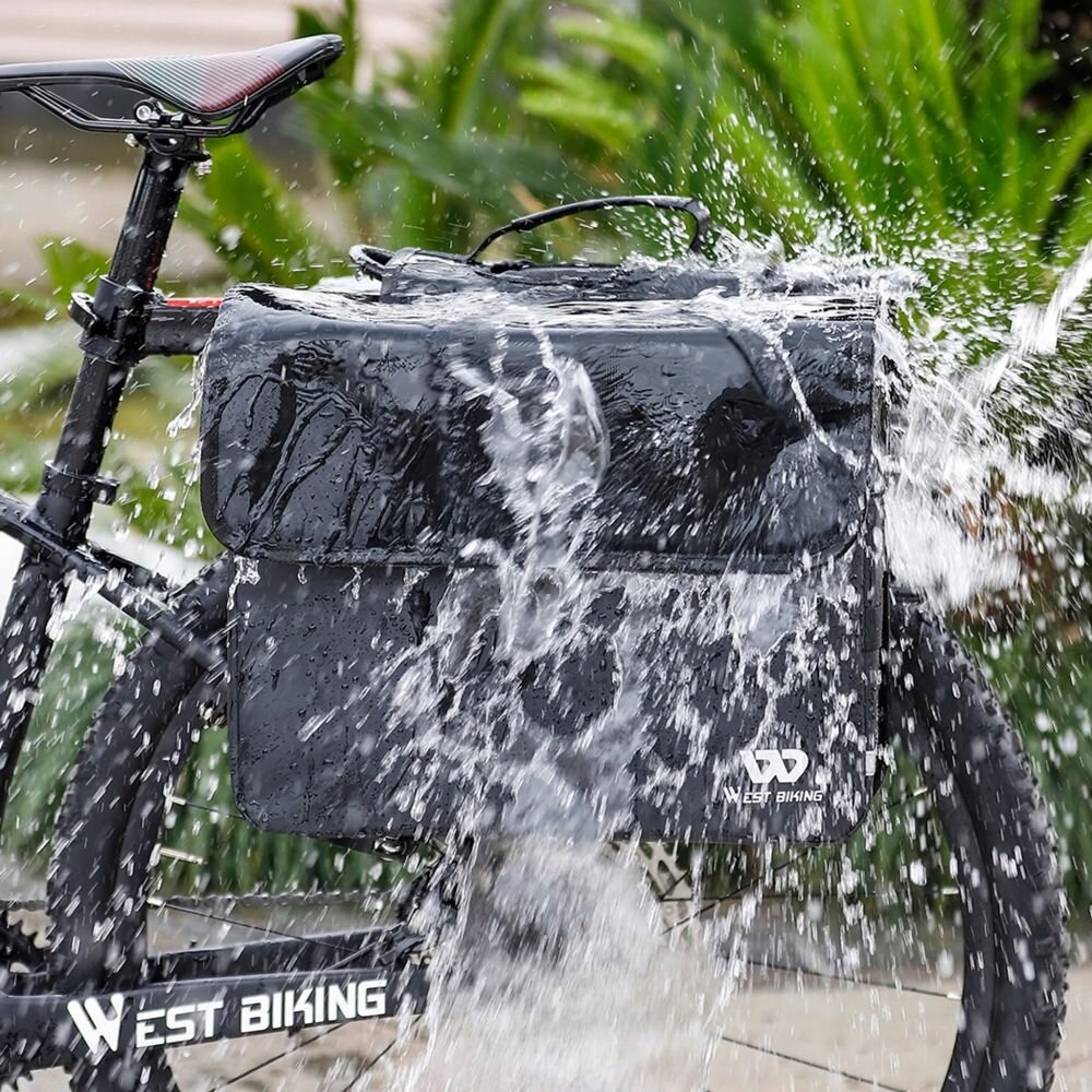 Torba rowerowa WEST BIKING to idealny wybór dla tych, którzy potrzebują dużo miejsca i niezawodnej ochrony swoich rzeczy. Dzięki łącznej pojemności aż 36 litrów (po 18L z każdej strony), bez trudu zmieścisz codzienne zakupy, ubrania czy ekwipunek na dłuższe wyprawy. Sprawdzi się zarówno w miejskiej dżungli, jak i na trasach terenowych. Wykonana z mocnego, wodoodpornego materiału 500D tarpaulin torba zapewnia trwałość i ochronę w każdych warunkach. Usztywnione boczne ścianki oraz solidna płyta na spodzie zapobiegają deformacjom i zwiększają stabilność podczas jazdy, nawet przy dużym obciążeniu. Torba jest również łatwa do utrzymania w czystości – wystarczy wilgotna ściereczka. Elementy odblaskowe – paski i logo – poprawiają widoczność rowerzysty w nocy. Dodatkowe miejsce na tylne światło zwiększa bezpieczeństwo podczas jazdy po zmroku. Torba montowana jest za pomocą solidnych pasków, które stabilnie utrzymują ją na bagażniku, nawet w trudnym terenie. Górny uchwyt umożliwia wygodne przenoszenie po zdjęciu z roweru. Klapowe zamknięcie zapewnia szybki dostęp do zawartości i jej skuteczne zabezpieczenie.