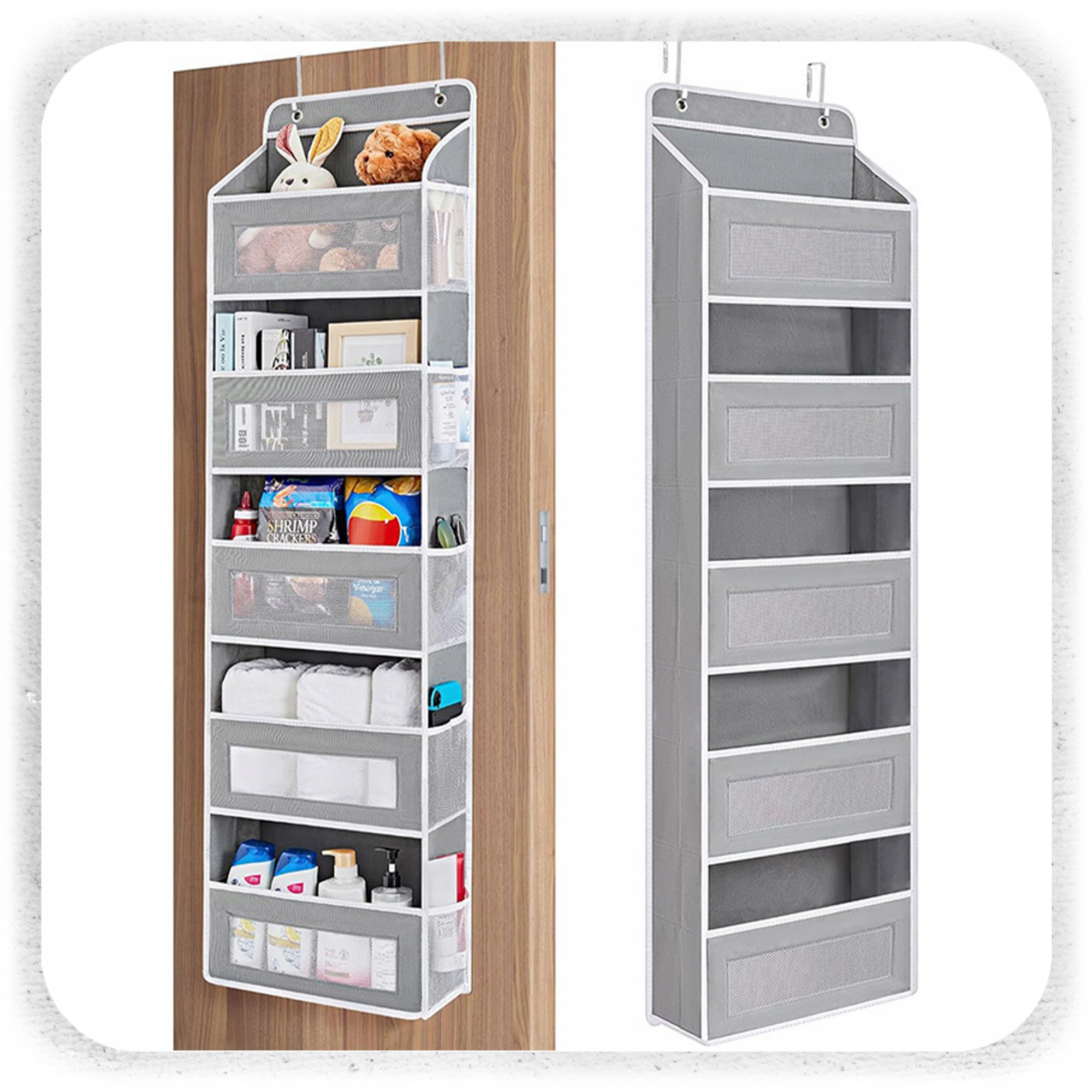 Organizer zawiesisz w kilka chwil na drzwiach, bez konieczności używania narzędzi. W komplecie otrzymujesz dwa solidne, metalowe haczyki, które pasują do drzwi o grubości do 4,5 cm. Wystarczy zawiesić i gotowe – oszczędność czasu i przestrzeni gwarantowana.