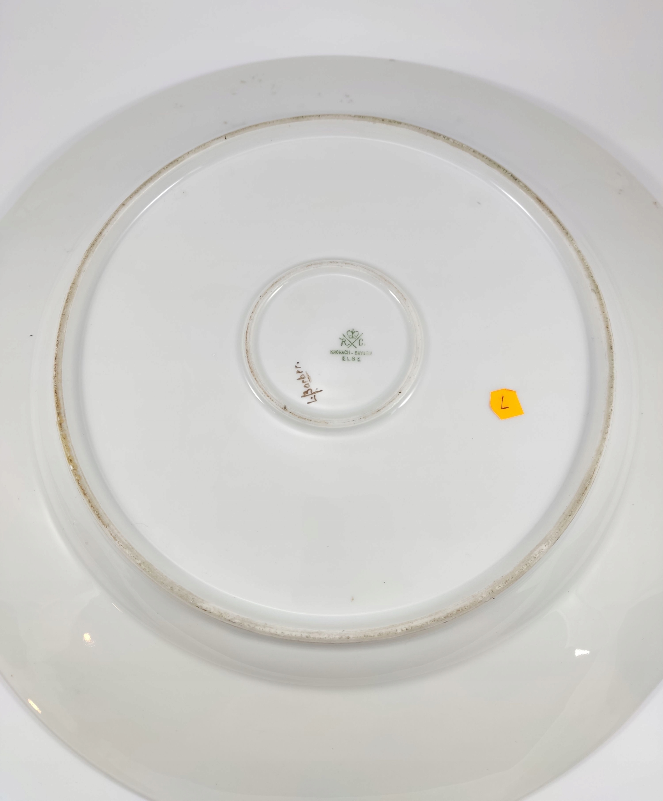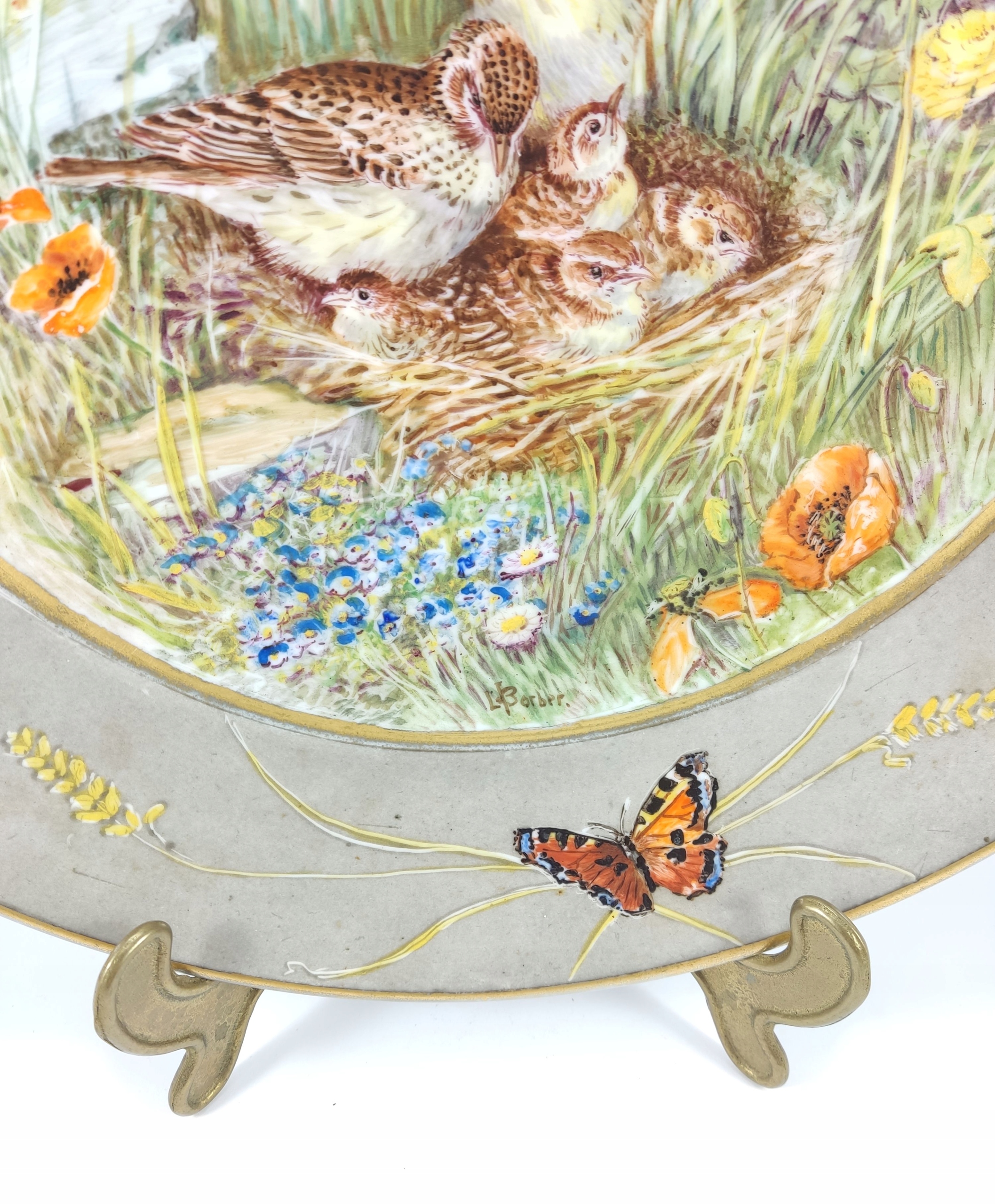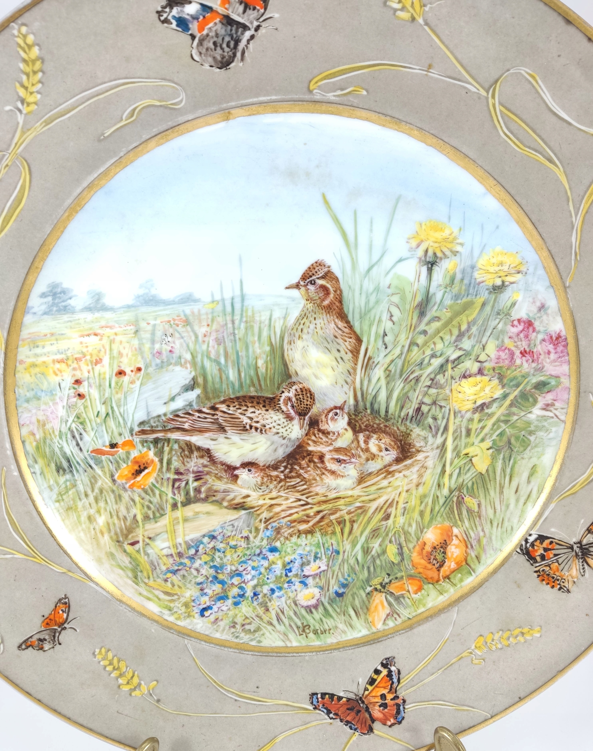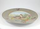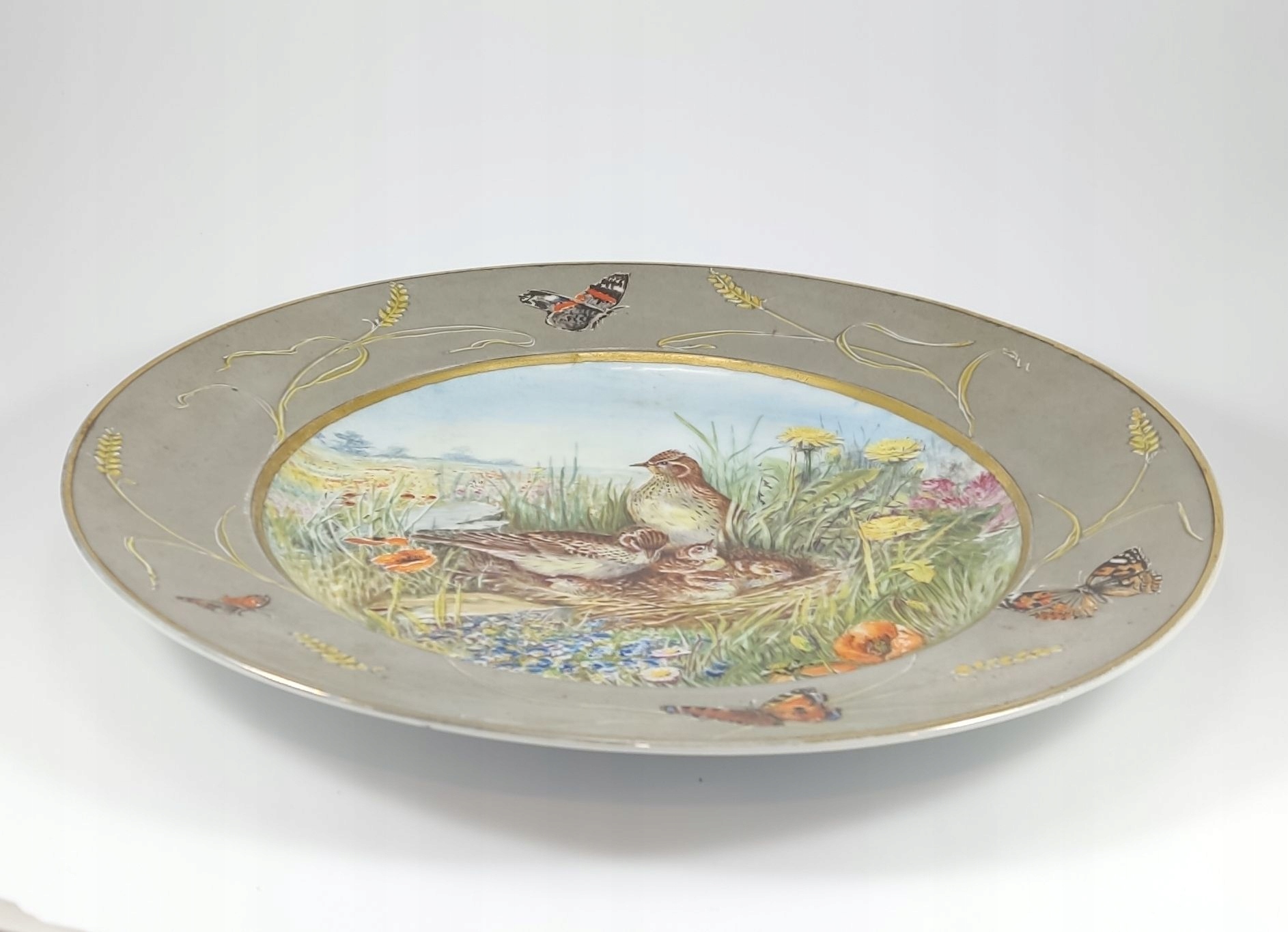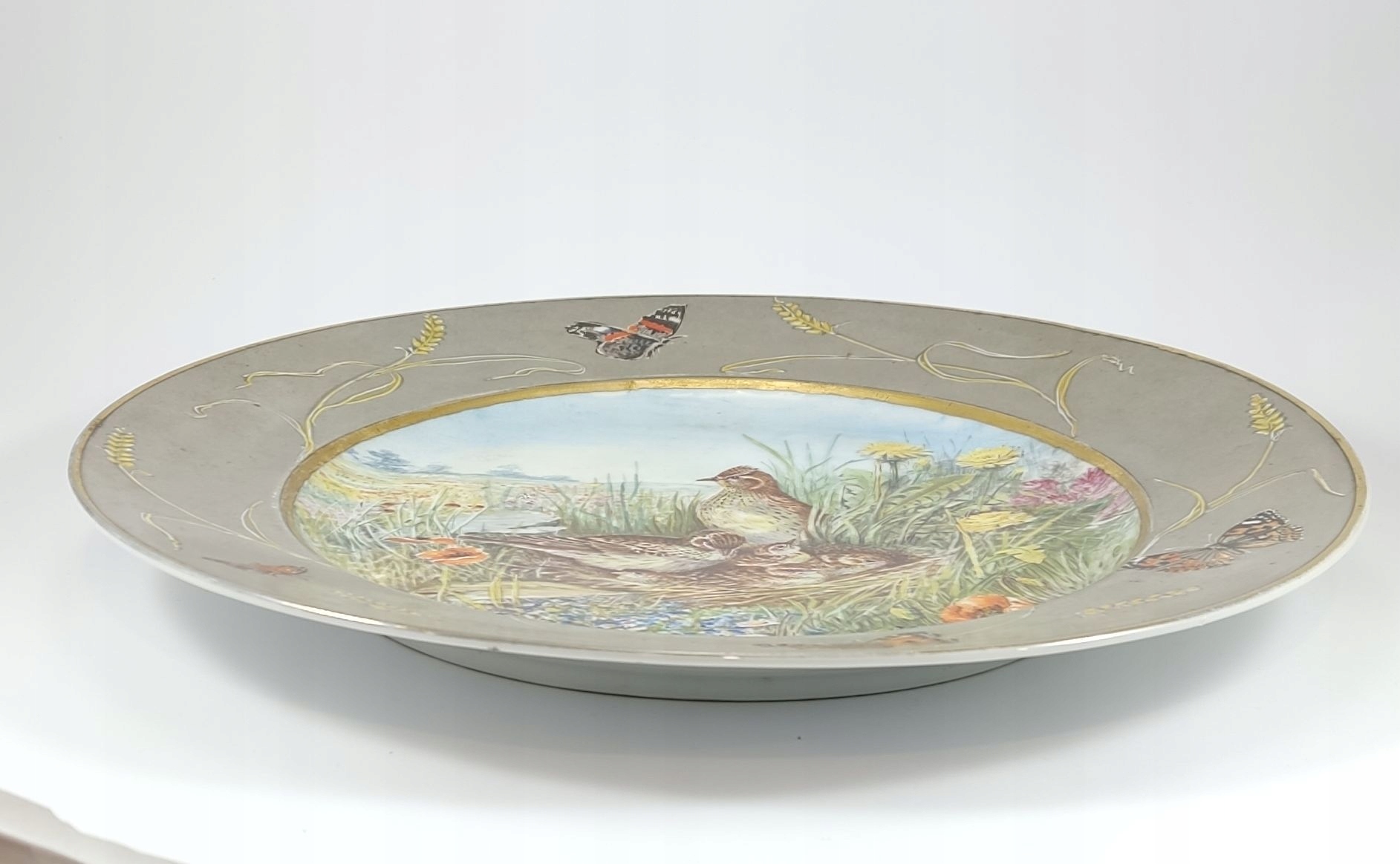 Patera zachwyca kunsztem ręcznego malarstwa – na tle kwitnącej łąki widzimy rodzinę skowronków, ujętą w żywych, subtelnie zestawionych barwach. Rant zdobiony kłosami i motylami tworzy ramę o niemal jubilerskiej precyzji, która nadaje całości wyjątkowego charakteru. Tego rodzaju duże, ręcznie malowane kompozycje należą do rzadkości i stanowią świadectwo najwyższej klasy niemieckiej porcelany z początku XX wieku.