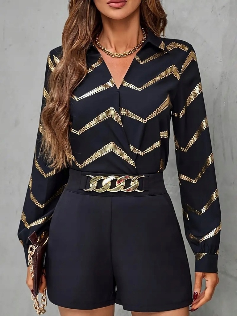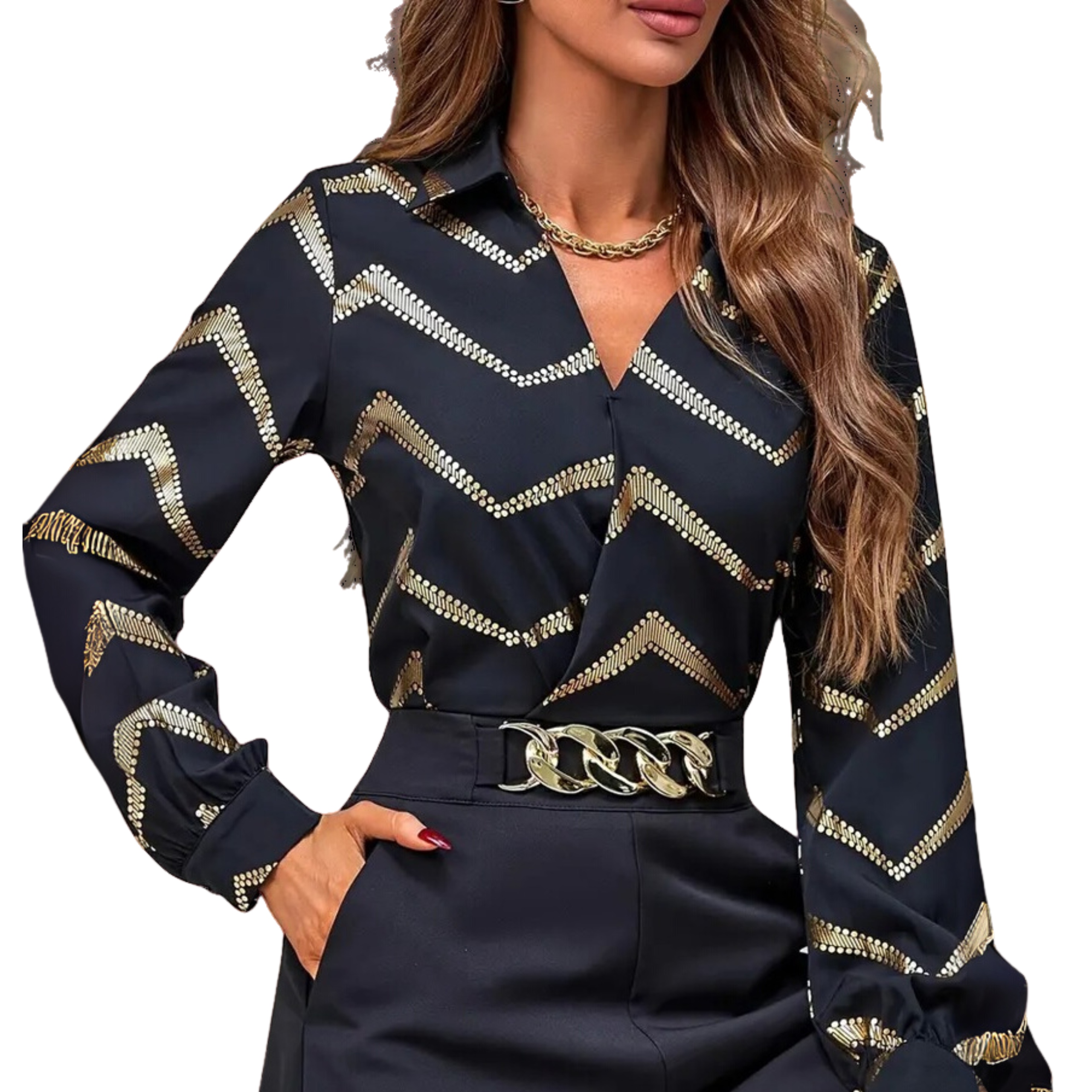 ✨ Wzór: Złote, połyskujące akcenty w formie geometrycznych zygzaków, które nadają bluzce luksusowego charakteru.