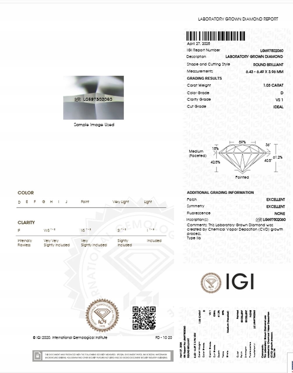 Diament laboratoryjny o masie 1.03 ct to wyjątkowy produkt, który sprawdzi się zarówno jako element biżuterii, jak również jako kamień inwestycyjny. Diament ten stanowi idealny wybór dla osób poszukujących eleganckiej, luksusowej biżuterii oraz kamieni inwestycyjnych. Diament emanuje niezrównanym połyskiem i witalnością światła, przyciągając spojrzenia i podkreślając prestiż biżuterii. Ze względu na najwyższą czystość i kolor, kamień zachowuje wysoką wartość na rynku.