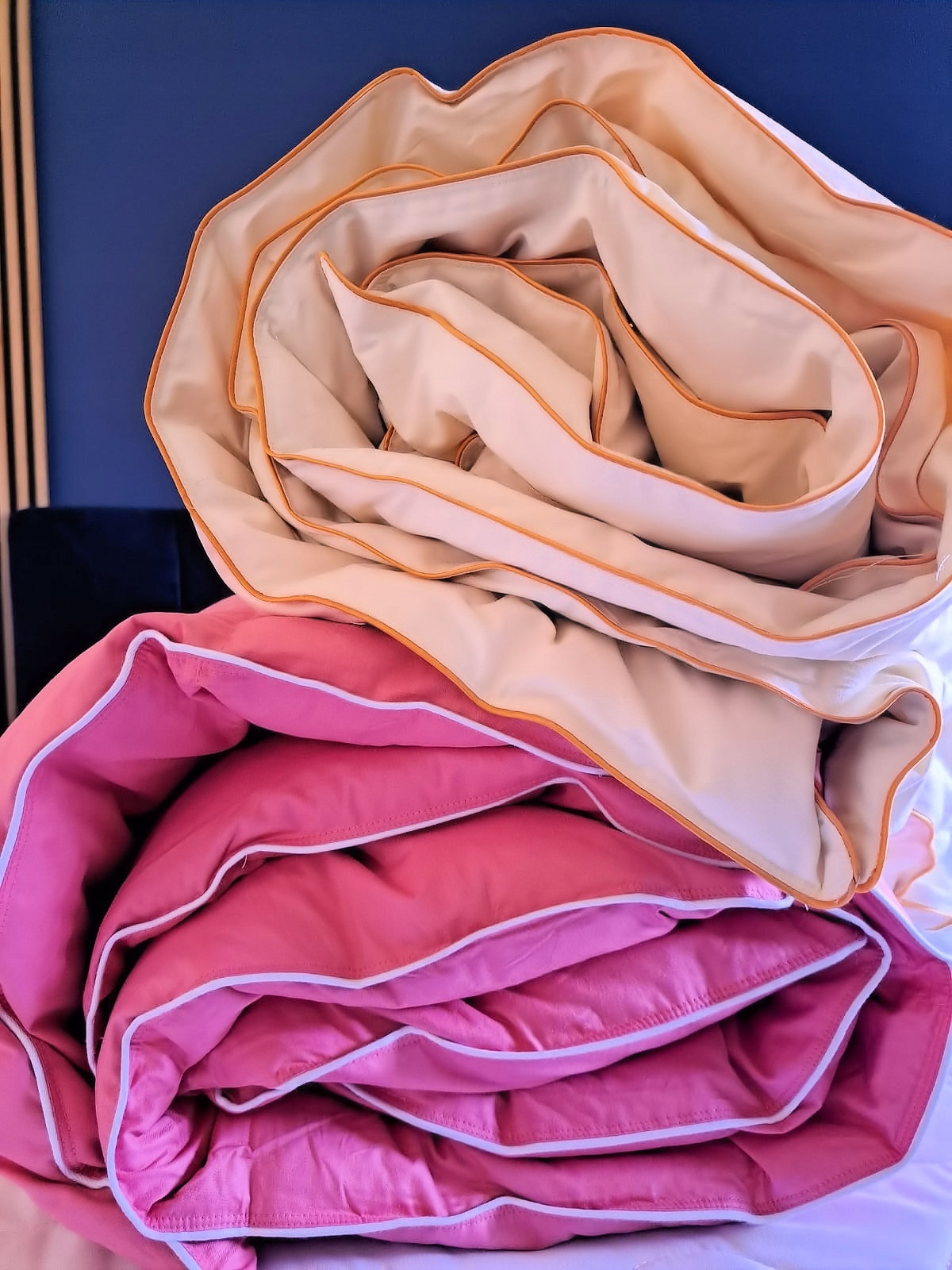Konstrukcja kasetonowa sprawia, że puch jest równomiernie rozłożony w całej kołdrze. Dzięki taśmie dystansowej kołdra unosi się i nie ma tzw " zimnych szewków"