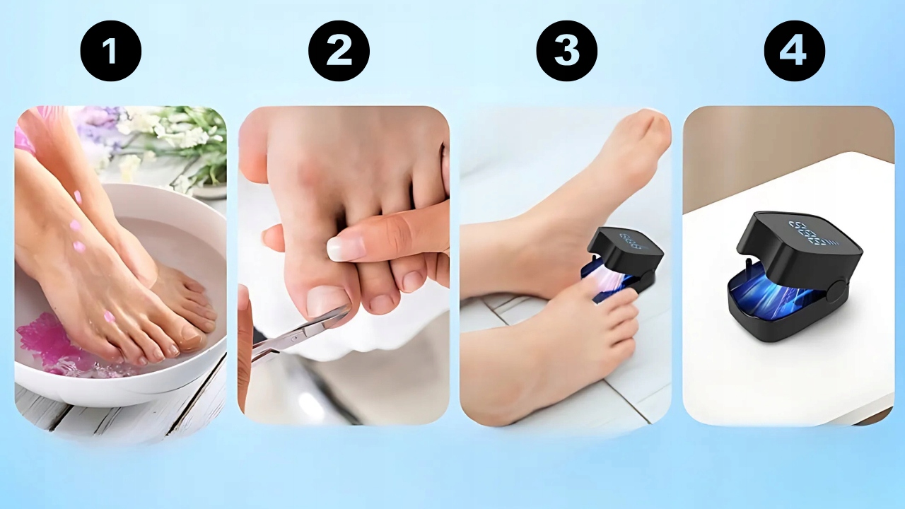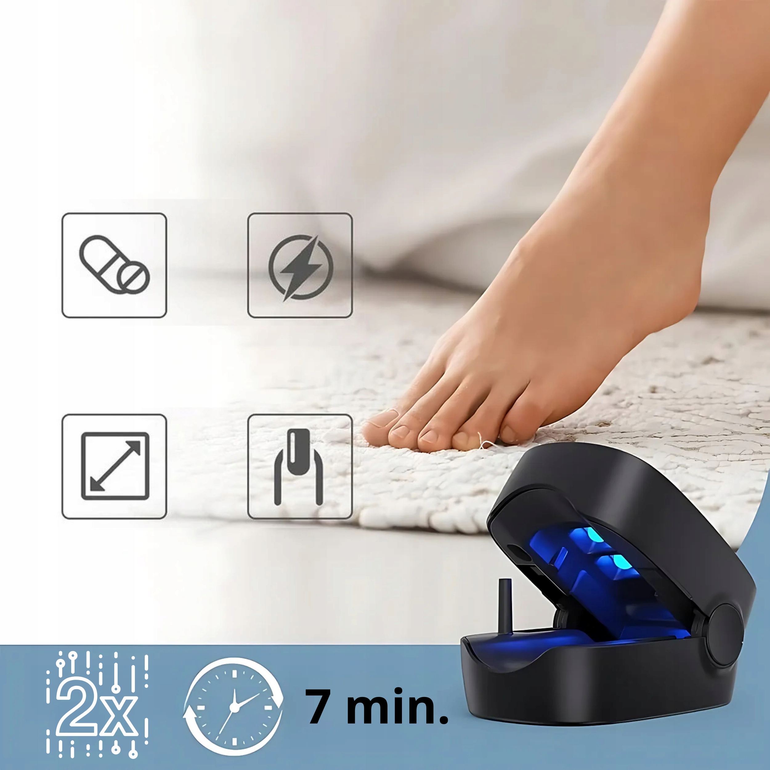 ➡️ Sposób użycia (skrót): oczyść i przytnij paznokcie krótko, zaciśnij urządzenie → po 7 min zdejmij