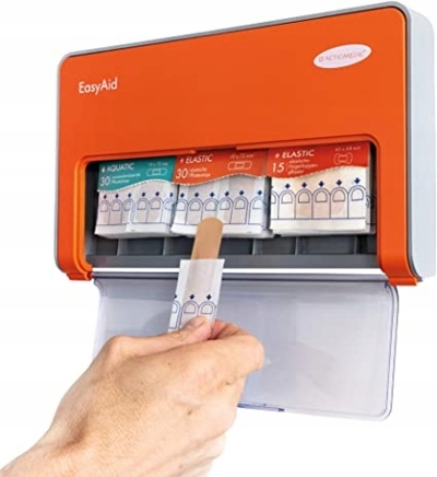 Jednoręczny dozownik plastrów, który może pomieścić do trzech rodzajów plastrów. Konieczność doładowania sygnalizuje inteligentny system Kanban. Wyjątek higieniczny dzięki otworowi w dół. Opcjonalnie istnieje możliwość zabezpieczenia przed kradzieżą. Zamknięta obudowa chroni zawartość przed zanieczyszczeniem nawet w trudnych warunkach. Łatwo go rozpoznać po pomarańczowym kolorze. Zawiera także materiały instalacyjne i instrukcję obsługi. Zawiera 1x 30 ELASTIC, 1x 15 ELASTIC opuszki palców i 1x 30 AQUATIC bandaże. Rozmiar plastrów zwykłych: 19 x 72 mm.