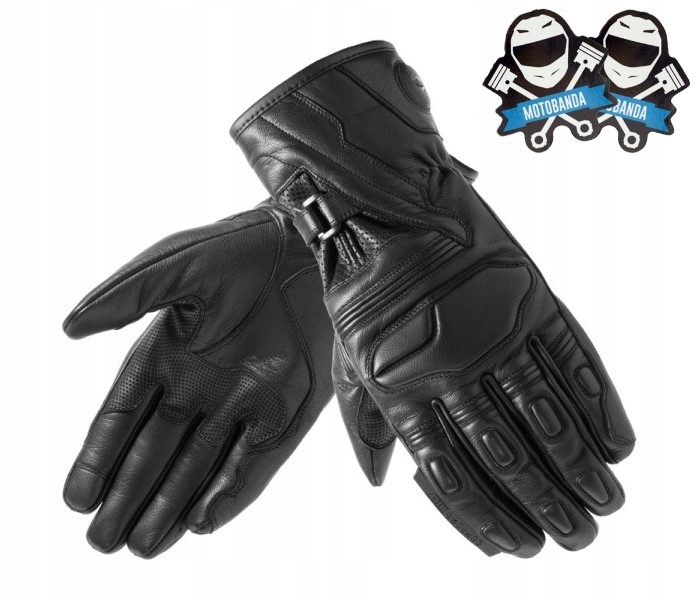 Motocyklowe rękawice skórzane z częściową perforacją zewnętrznej części dłoni i pełną palców. Na kostkach mają panele z pianki absorbującej uderzenia. Wnętrze uszyte z podwójnej warstwy materiału. Mają elastyczne elementy i paski regulacyjne. W rękawicach można obsługiwać ekrany dotykowe.