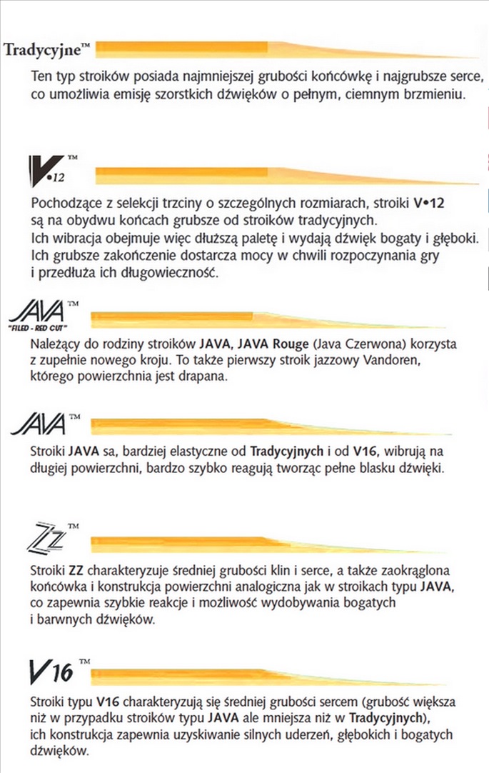 Najczęściej stosowane na świecie stroiki saksofonowe, o potwierdzonej przez lata jakości. Odpowiednie dla wszystkich rodzajów muzyki. Za cel leżący u podstaw koncepcji tego nowego stroika należy uznać chęć zaproponowania muzykom większego wyboru przy zachowaniu zalet świata JAVA. Bardziej giętki niż jego pierwowzór, o nieco większym korpusie, JAVA Red oferuje brzmienie pełne, zagęszczone i ściśnięte oraz gwarantuje doskonałą projekcję i wielką precyzję w rozpoczynaniu gry.