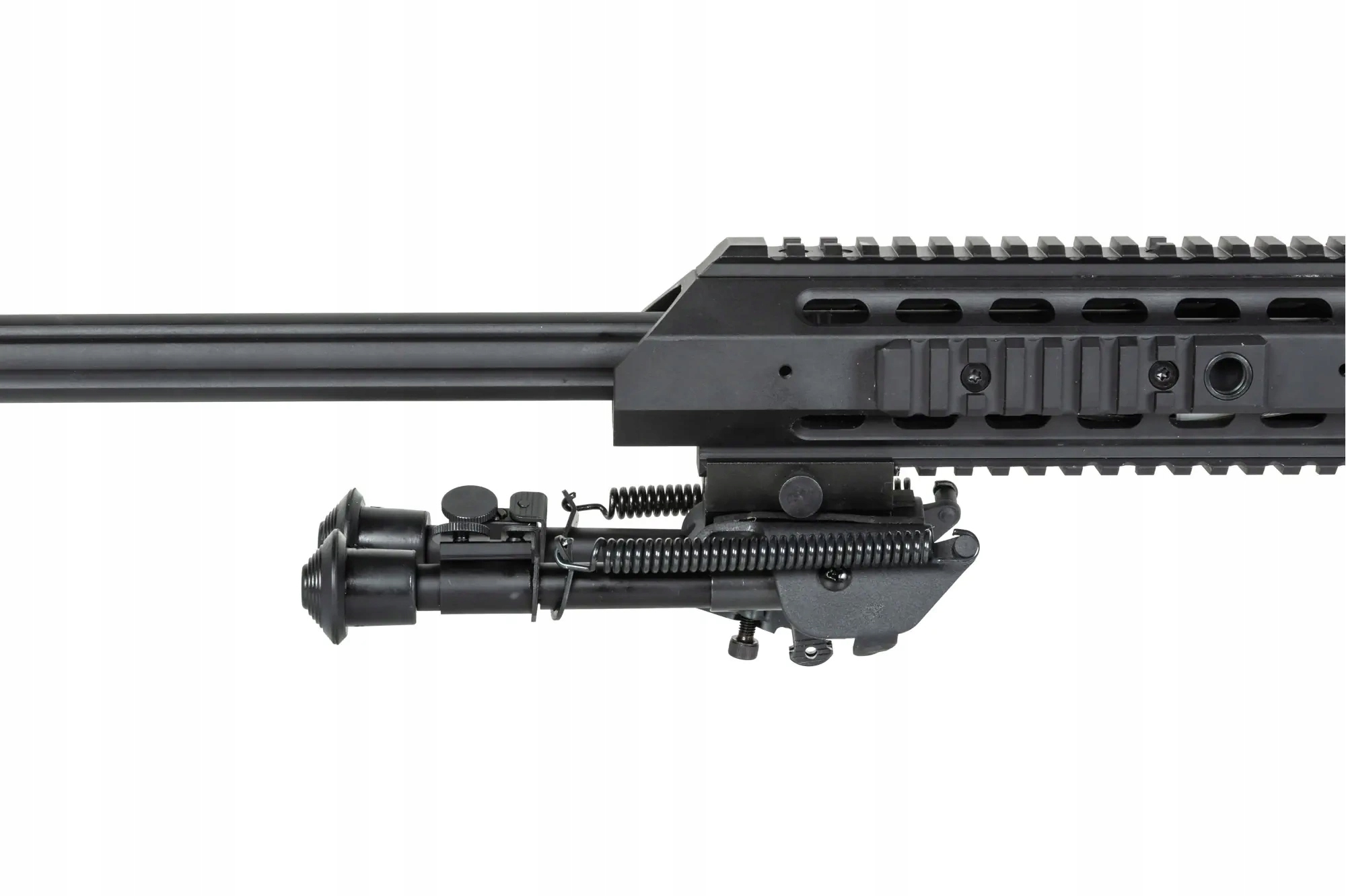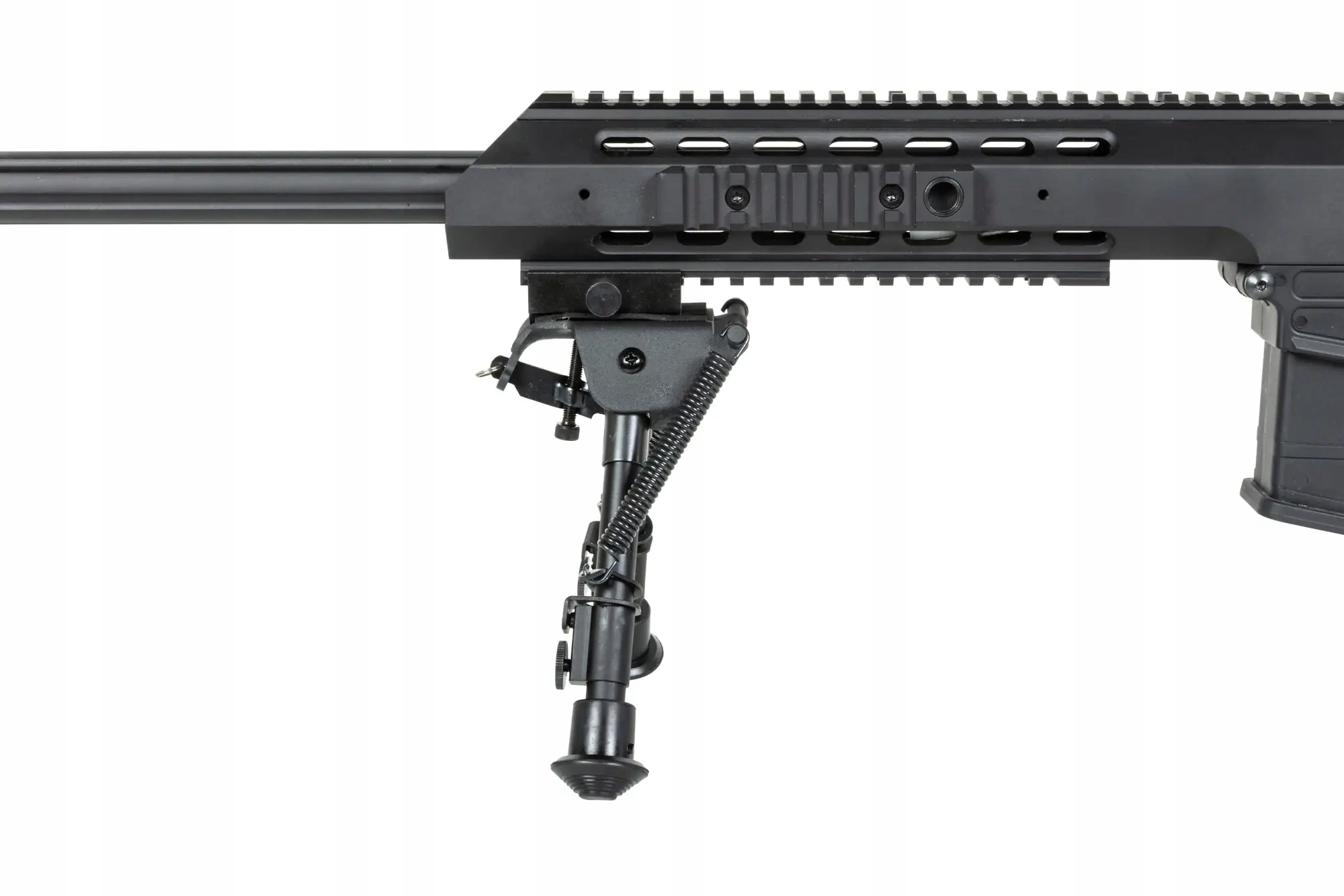 W zestawie znajdziemy również regulowany, składany bi-pod montowany na szynę RIS oraz atrapę puszki PEQ służącą za schowek na akumulator. Ponad to replika posiada 5 gniazd zawieszenia QD dla dowolnego rozmieszczenia zaczepów (2 ucha QD znalazły się w komplecie). 4 szyny RIS o różnej długości rozmieszczone wzdłuż frontu pozwolą na dowolną modyfikację karabinka.
