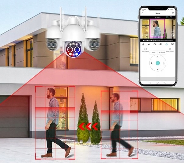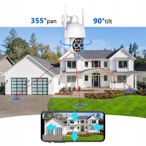 Kamera IP WiFi rejestruje obraz w rozdzielczości 8MP (3840×2160px). Model Techage XM-PT825D 80W ma obrót kamery w zakresie 355° w poziomie i 90° w pionie, dzięki czemu pokrywa praktycznie całą przestrzeń w pobliżu. Obracać kamerę można: