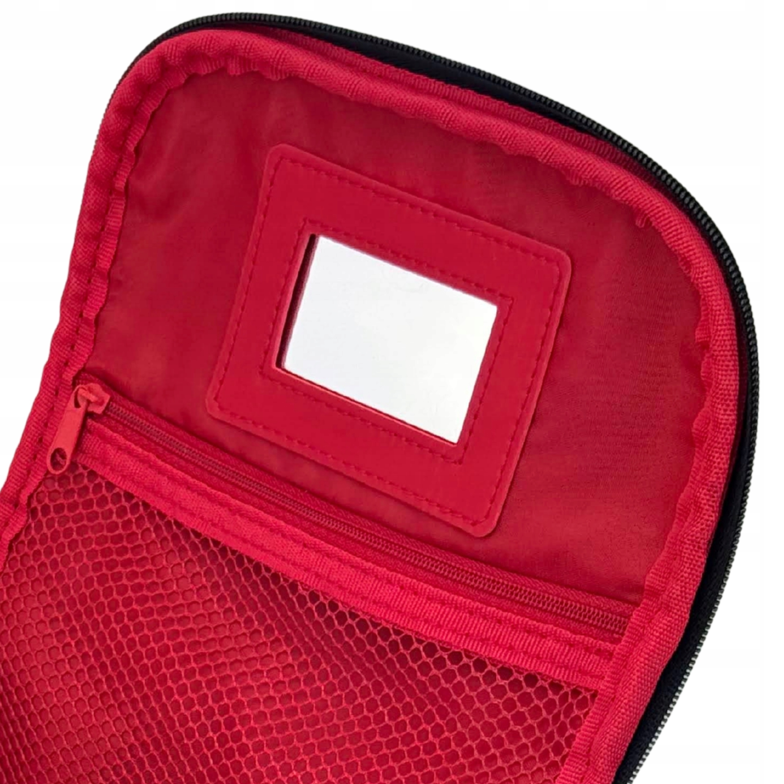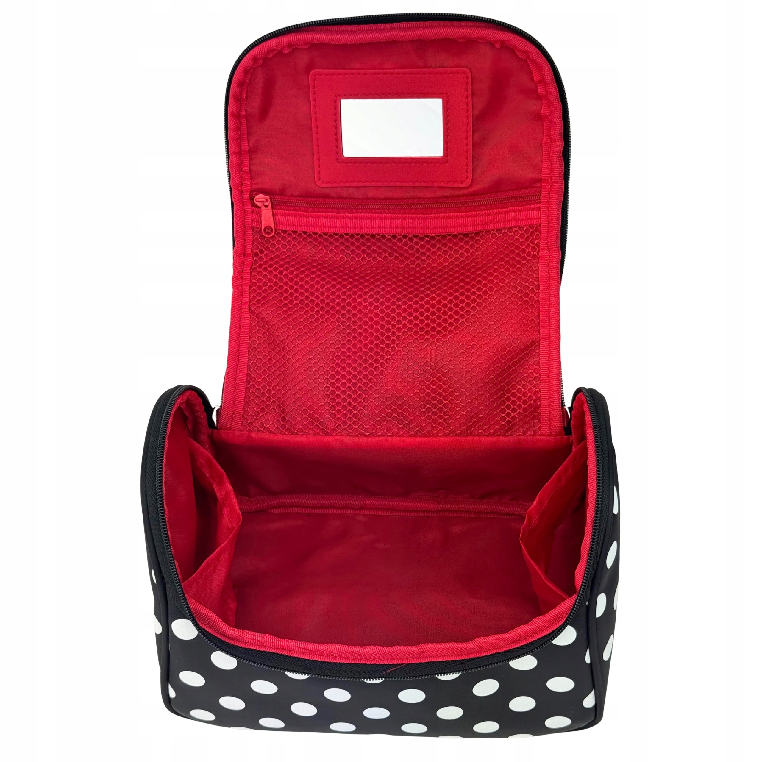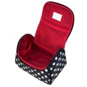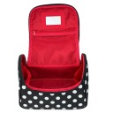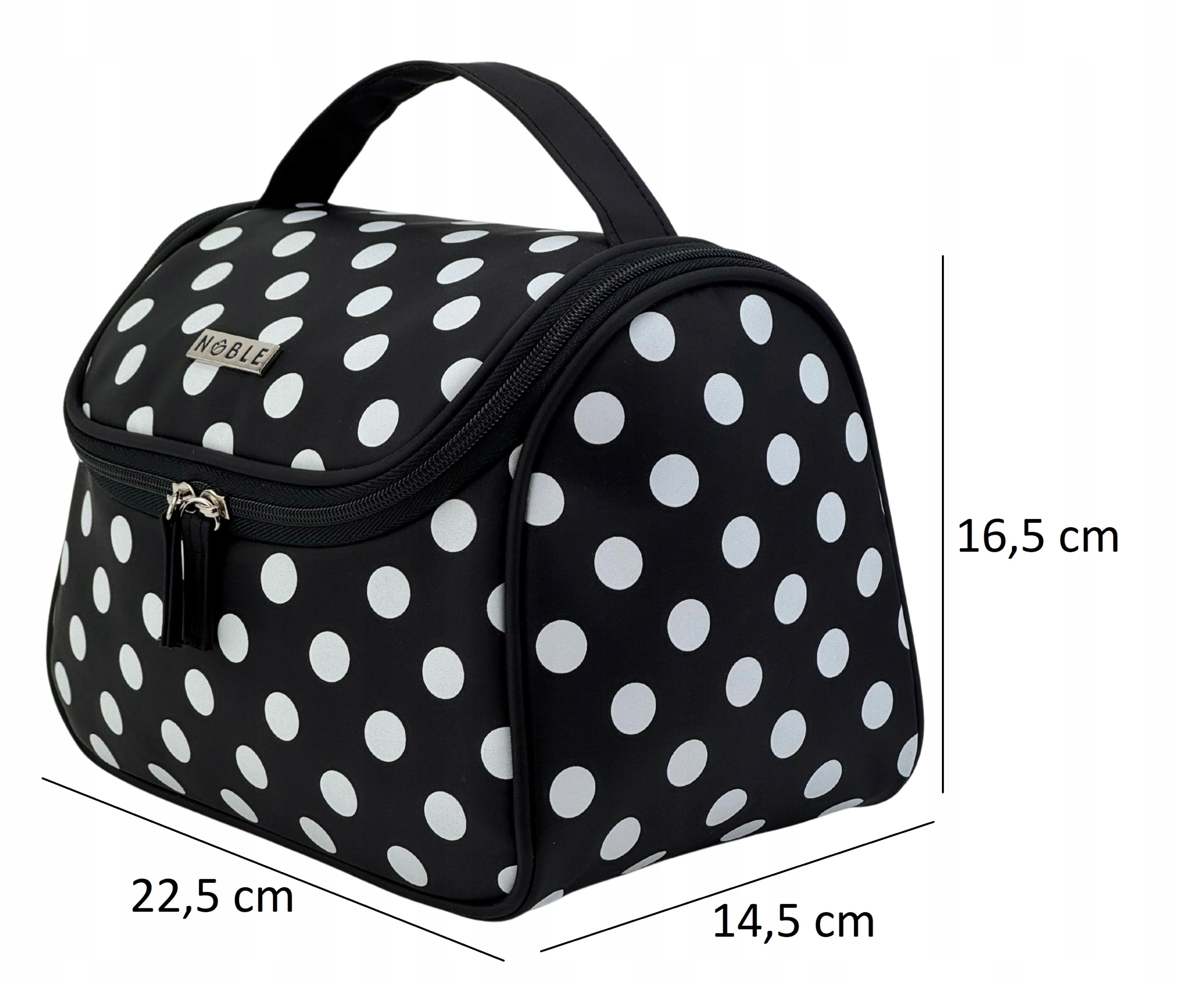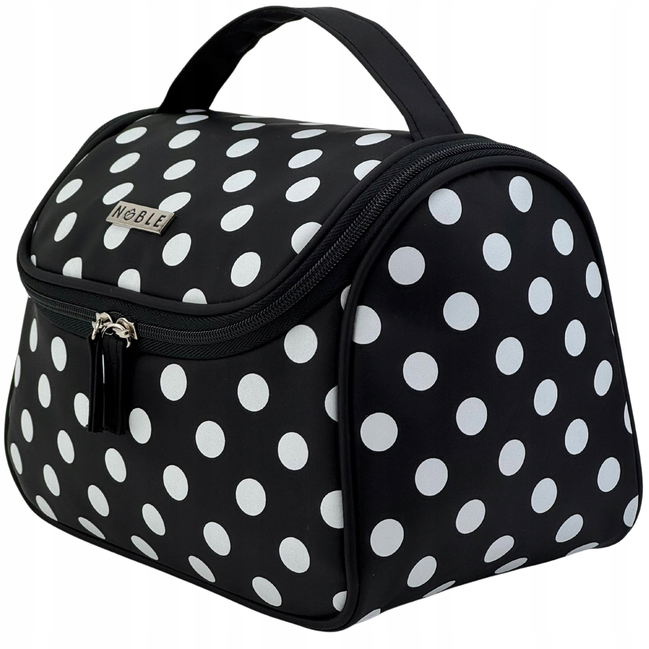 Kosmetyczka Modern M004 marki NOBLE. Posiada kształt poręcznego kuferka, średniej wielkości z materiałową rączką do transportu. Wykonany został z łatwego do czyszczenia, czarnego materiału z białymi groszkami i czerwonym materiałem w środku. Posiada trójkątny kształt z szeroko otwieraną u góry klapką na podwójny suwak. We wnętrzu znajduje się jedna spora komora z paskami przytrzymującymi z obu stron np. na suszarkę. Na wewnętrznej stronie klapy została umieszczona siateczkowa kieszonka na zamek oraz małe poręczne lusterko. Kosmetyczka idealnie sprawdzi się w każdej podróży.