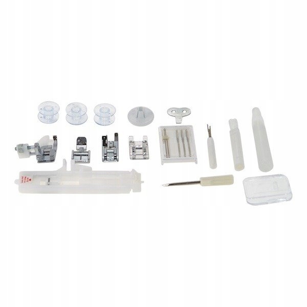 Malwina 2070 black edition oferuje pełen zestaw akcesoriów: od stolika poszerzającego pole pracy, przez różnorodne stopki, aż po komplet igieł i narzędzi niezbędnych do jej konserwacji i czyszczenia.