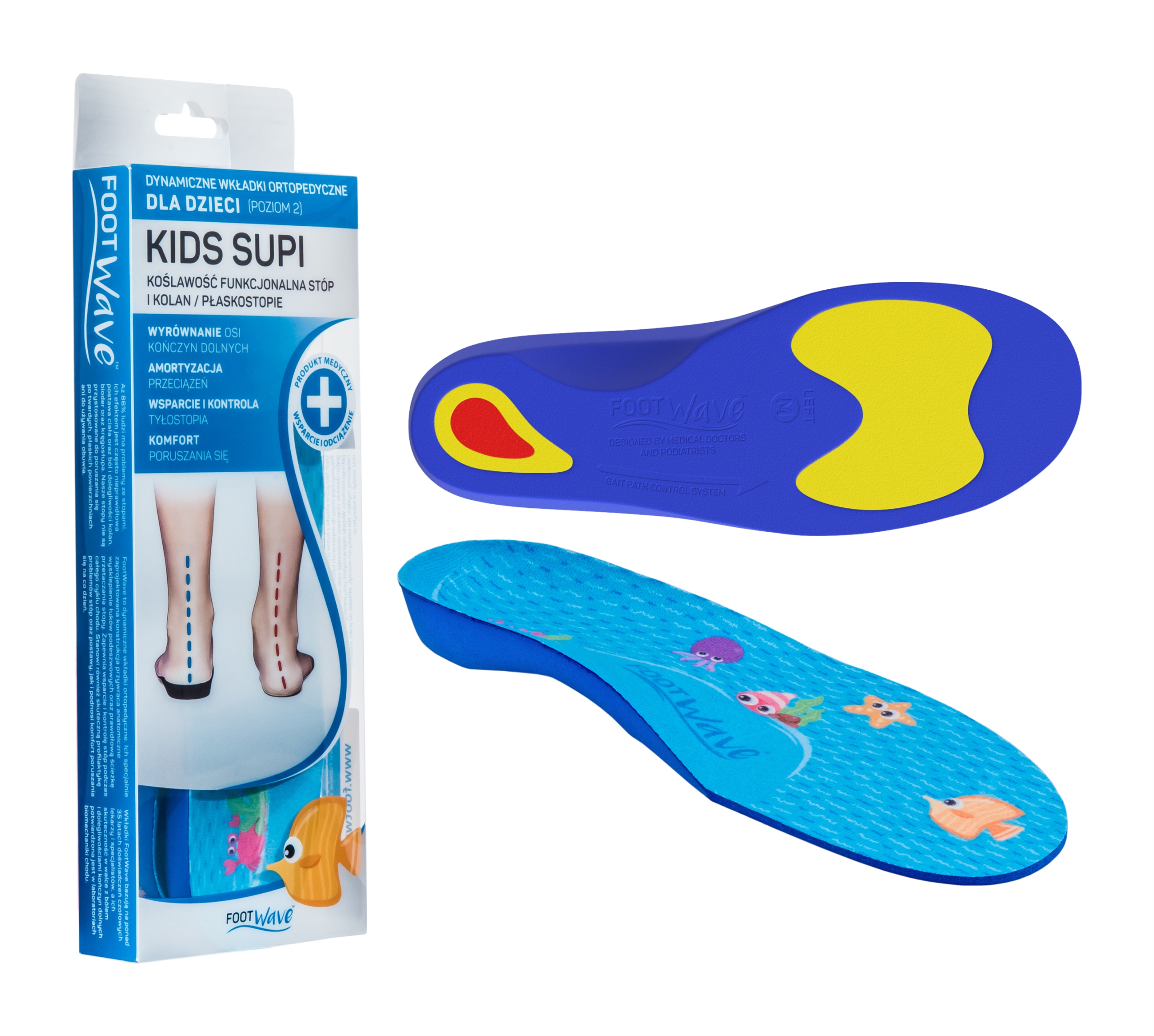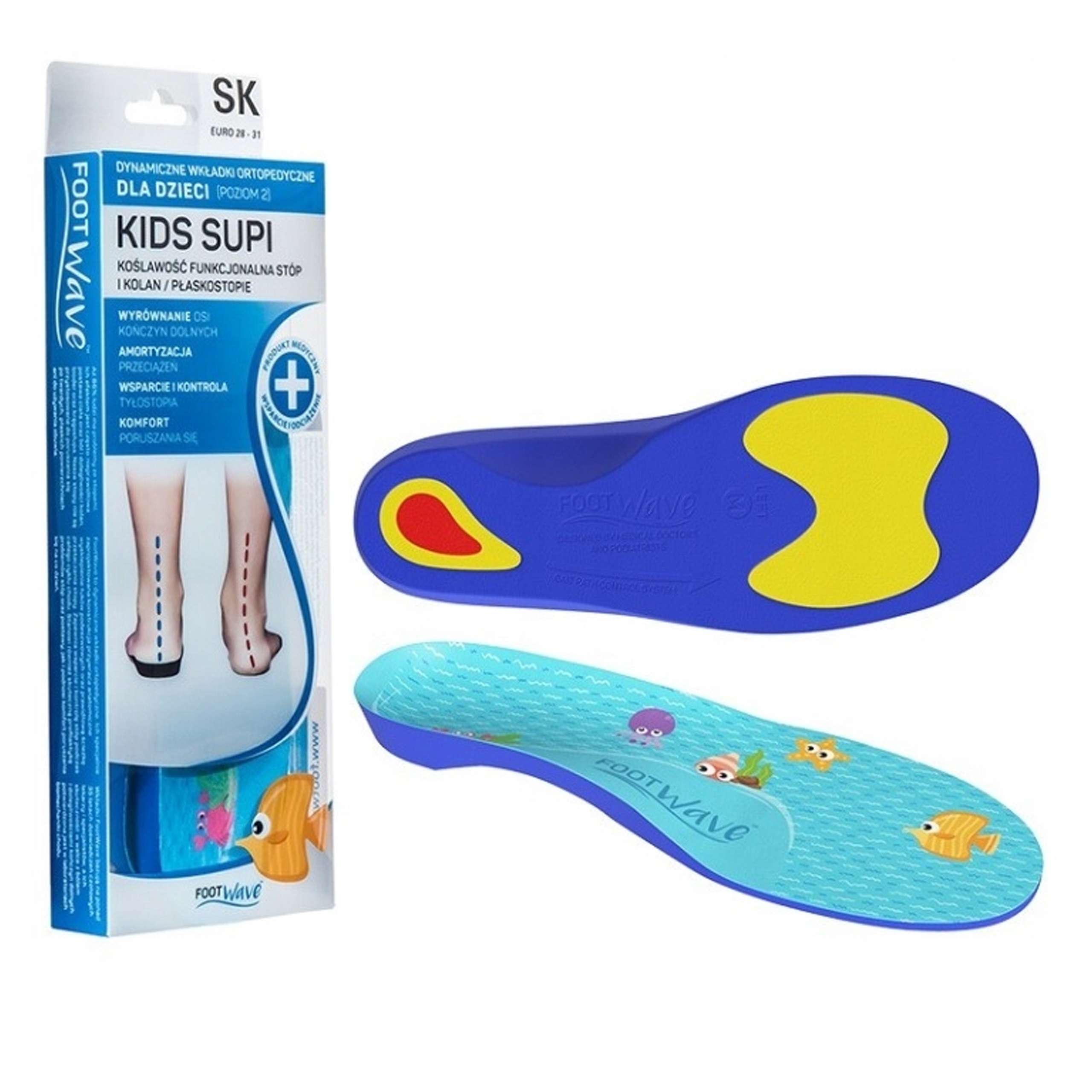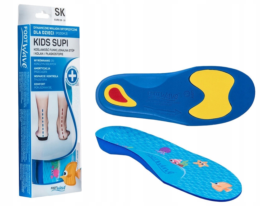 Dynamiczne wkładki ortopedyczne FootWave KIDS SUPI to bezpieczne medyczne wkładki zaprojektowane z myślą o dzieciach, u których stwierdzono koślawość stóp i kolan lub płaskostopie. Unikatowa budowa dynamicznych wkładek FootWave pomaga zmniejszyć ból stóp dziecka, szczególnie pięty, zwiększa stabilność i komfort poruszania się. Wkładki FootWave Kids mogą być stosowane zarówno jako leczenie koślawości i płaskostopia u dzieci, jak i profilaktycznie, aby zapobiegać powyższym dolegliwościom. Pomagają w okresie intensywnego wzrostu dziecka.