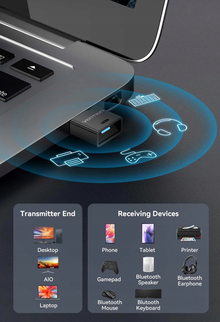 Vention USB Bluetooth Adapter NALB0 to małe, dyskretne i wygodne rozwiązanie dla każdego laptopa lub komputera stacjonarnego. Dzięki niemu szybko i łatwo przełączysz się między czterema sparowanymi urządzeniami. Będziesz mógł cieszyć się stabilnym połączeniem nawet z odległości 20 metrów.