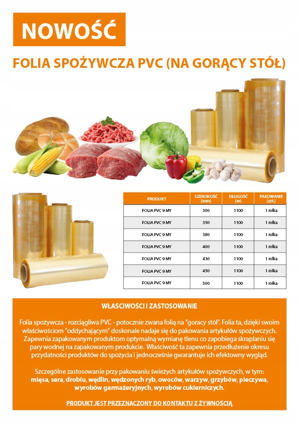 Folia PVC spożywcza o doskonałej elastyczności, trwałości i przejrzystości. Doskonale nadaje się do przechowywania żywności, zapewniając jej świeżość i ochronę przed wilgocią, zanieczyszczeniami oraz kurzem.