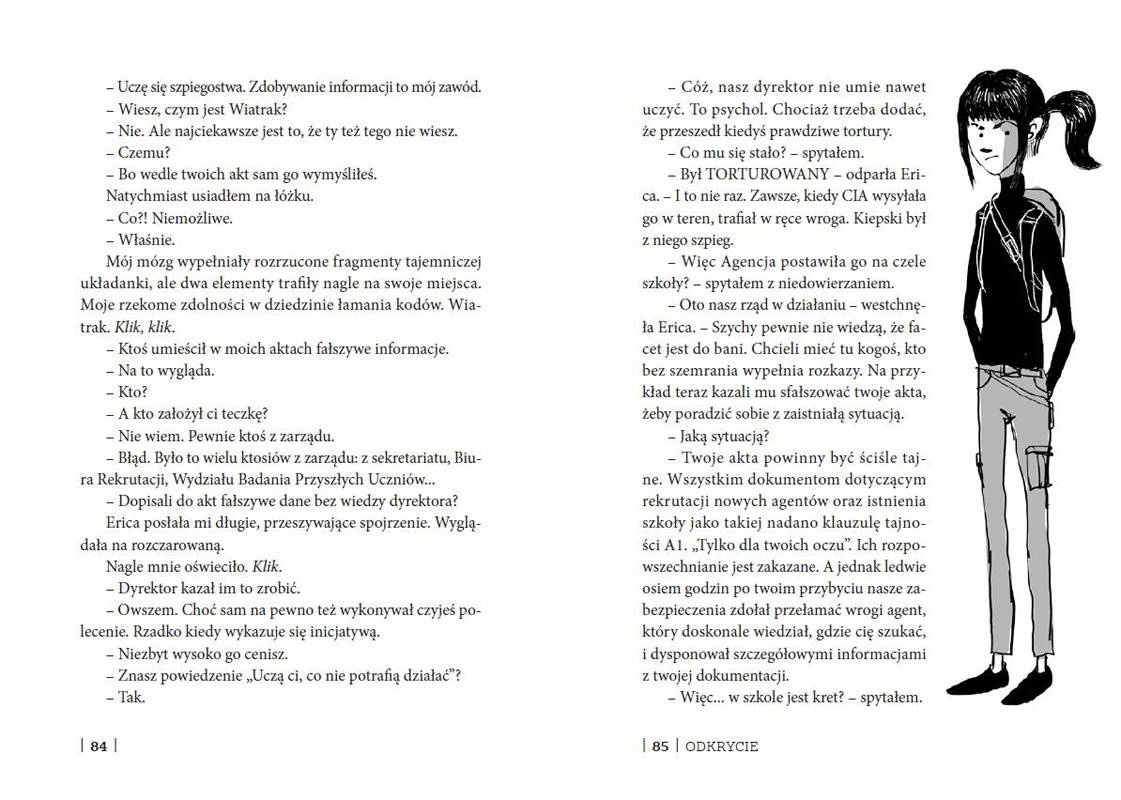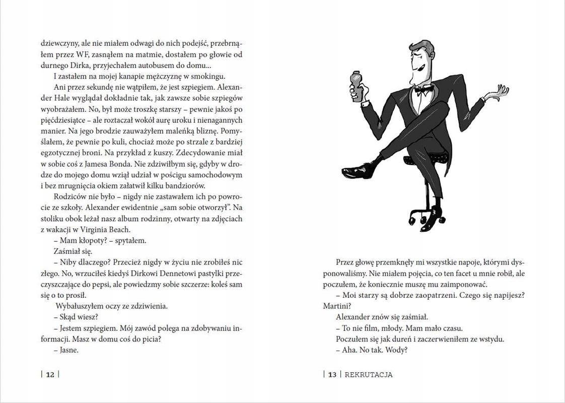 „Szkoła Szpiegów” to pierwsza z serii książek o zwariowanych przygodach młodego szpiega z przypadku oraz jego koleżanek i kolegów z Akademii Szpiegostwa. Pełna zwrotów akcji i humoru powieść przywodzi na myśl wybuchową mieszankę Jamesa Bonda, Harry’ego Pottera, Różowej Pantery i Jasia Fasoli. Nie tylko wciąga od pierwszego zdania, ale też przyprawia o ból brzucha ze śmiechu.